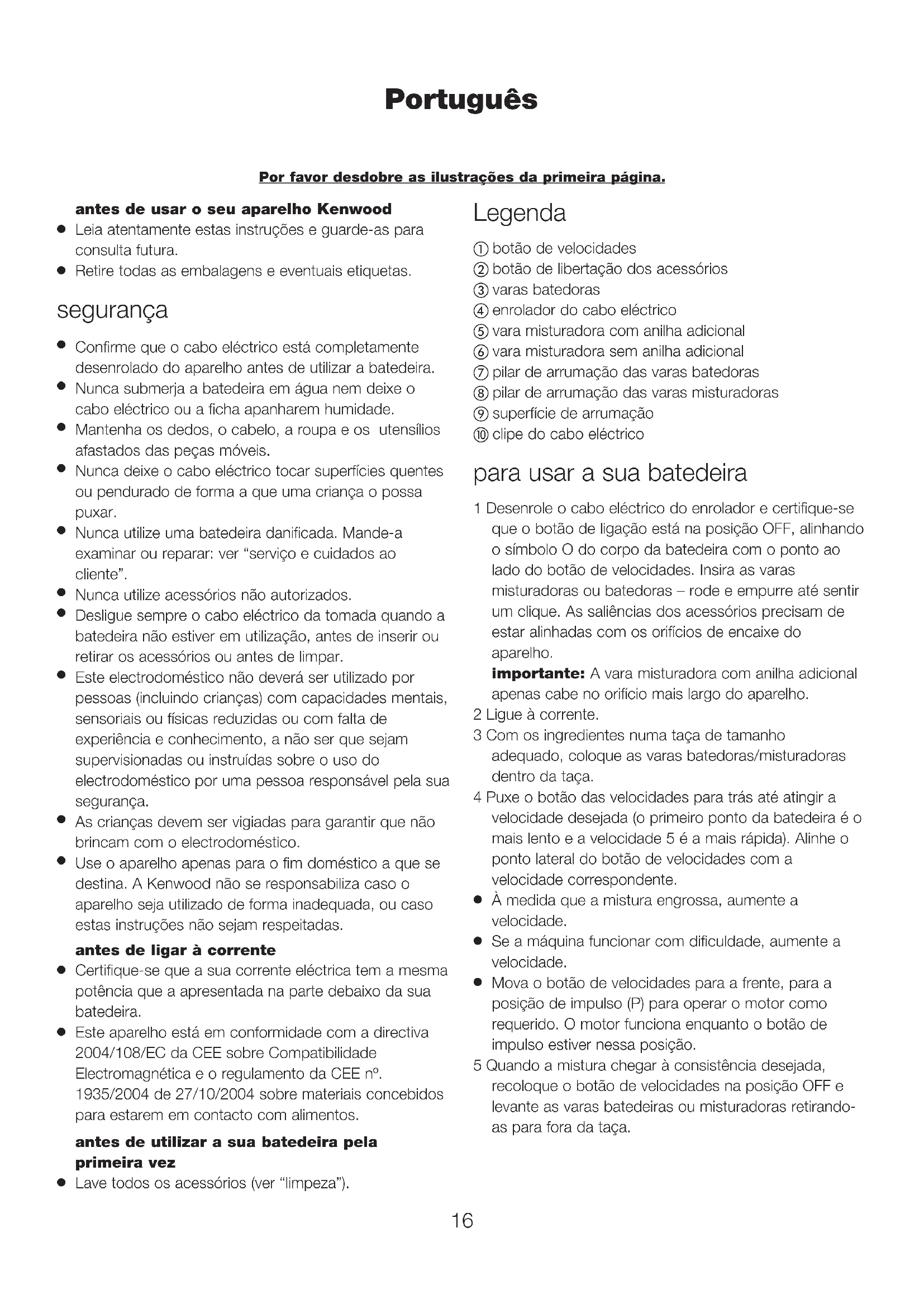 Este aparelho está em conformidade com a directiva 2004/108/EC da CEE sobre Compatibilidade Electromagnética e o regulamento da CEE nº. 1935/2004 de 27/10/2004 sobre materiais concebidos para estarem em contacto com alimentos. antes de utilizar a sua batedeira pela primeira vez