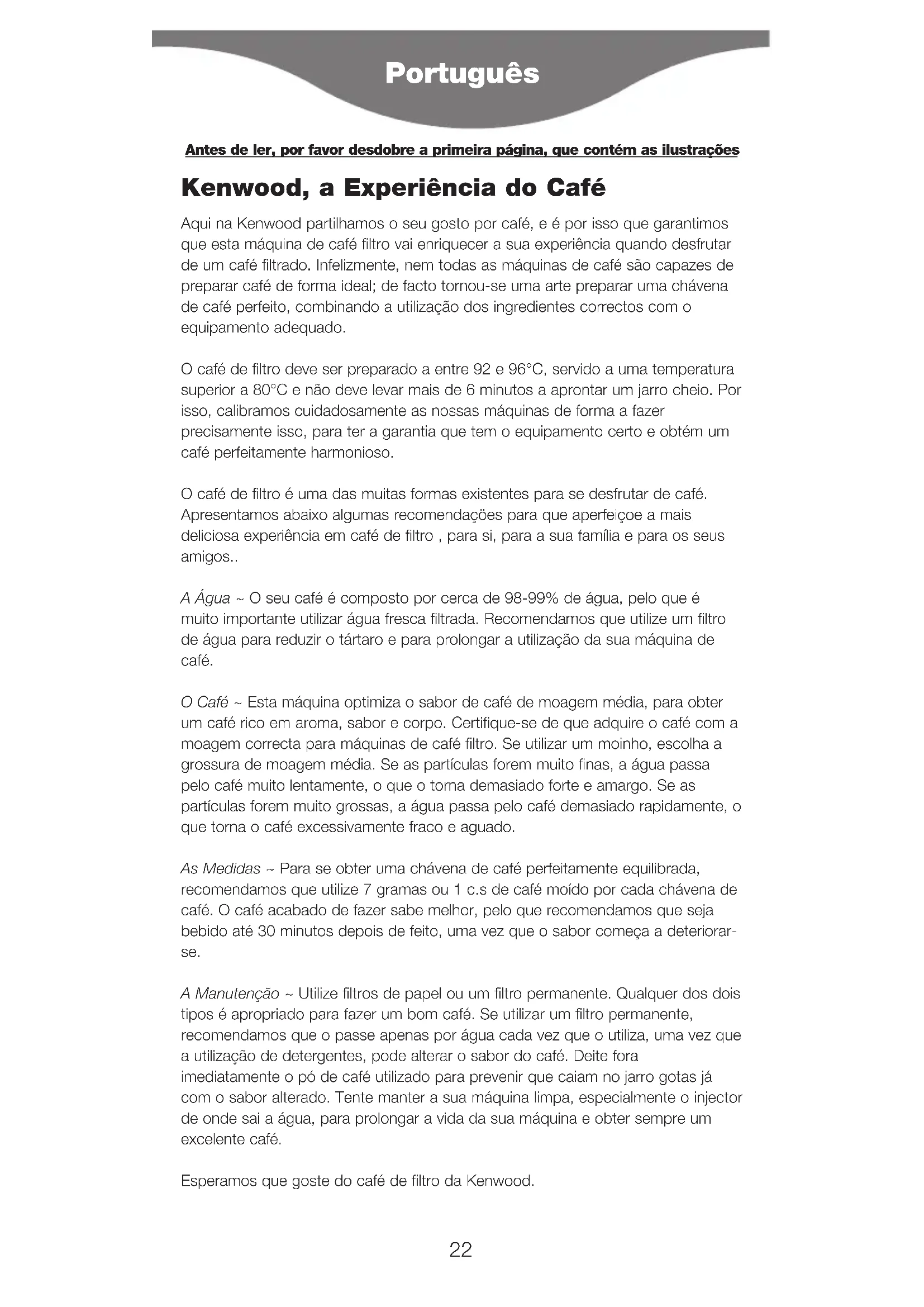 DIRETTIVA EUROPEA 2002/96/EC. Alla fine della sua vita utile il prodotto non deve essere smaltito insieme ai rifiuti urbani. Deve essere consegnato presso gli appositi centri di raccolta differenziata predisposti dalle amministrazioni comunali, oppure presso i rivenditori che offrono questo servizio. Smaltire separatamente un elettrodomestico consente di evitare possibili conseguenze negative per l’ambiente e per la salute derivanti da un suo smaltimento inadeguato e permette di recuperare i materiali di cui è composto al fine di ottenere notevoli risparmi in termini di energia e di risorse. Per rimarcare l’obbligo di smaltire separatamente gli elettrodomestici, sul prodotto è riportato il simbolo del bidone a rotelle barrato. 21Kenwood, a Experiência do Café Aqui na Kenwood partilhamos o seu gosto por café, e é por isso que garantimos que esta máquina de café filtro vai enriquecer a sua experiência quando desfrutar de um café filtrado. Infelizmente, nem todas as máquinas de café são capazes de preparar café de forma ideal; de facto tornou-se uma arte preparar uma chávena de café perfeito, combinando a utilização dos ingredientes correctos com o equipamento adequado. O café de filtro deve ser preparado a entre 92 e 96°C, servido a uma temperatura superior a 80°C e não deve levar mais de 6 minutos a aprontar um jarro cheio. Por isso, calibramos cuidadosamente as nossas máquinas de forma a fazer precisamente isso, para ter a garantia que tem o equipamento certo e obtém um café perfeitamente harmonioso. O café de filtro é uma das muitas formas existentes para se desfrutar de café. Apresentamos abaixo algumas recomendaçöes para que aperfeiçoe a mais deliciosa experiência em café de filtro , para si, para a sua família e para os seus amigos.. A Água ~ O seu café é composto por cerca de 98-99% de água, pelo que é muito importante utilizar água fresca filtrada. Recomendamos que utilize um filtro de água para reduzir o tártaro e para prolongar a utilização da sua máquina de café. O Café ~ Esta máquina optimiza o sabor de café de moagem média, para obter um café rico em aroma, sabor e corpo. Certifique-se de que adquire o café com a moagem correcta para máquinas de café filtro. Se utilizar um moinho, escolha a grossura de moagem média. Se as partículas forem muito finas, a água passa pelo café muito lentamente, o que o torna demasiado forte e amargo. Se as partículas forem muito grossas, a água passa pelo café demasiado rapidamente, o que torna o café excessivamente fraco e aguado. As Medidas ~ Para se obter uma chávena de café perfeitamente equilibrada, recomendamos que utilize 7 gramas ou 1 c.s de café moído por cada chávena de café. O café acabado de fazer sabe melhor, pelo que recomendamos que seja bebido até 30 minutos depois de feito, uma vez que o sabor começa a deteriorar- se. A Manutenção ~ Utilize filtros de papel ou um filtro permanente. Qualquer dos dois tipos é apropriado para fazer um bom café. Se utilizar um filtro permanente, recomendamos que o passe apenas por água cada vez que o utiliza, uma vez que a utilização de detergentes, pode alterar o sabor do café. Deite fora imediatamente o pó de café utilizado para prevenir que caiam no jarro gotas já com o sabor alterado. Tente manter a sua máquina limpa, especialmente o injector de onde sai a água, para prolongar a vida da sua máquina e obter sempre um excelente café. Esperamos que goste do café de filtro da Kenwood. Português
