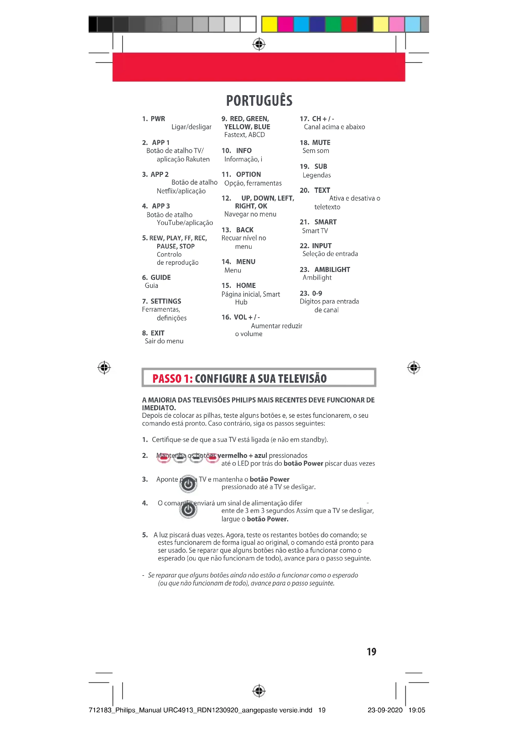 mesmo tempo até que o LED sob o botão POWER pisque duas vezes.2. Agora aponte o comando na direção da/o barra de som/dispositivo áudio e mantenha pressionado o botão com o dígito correspondente à sua marca (por exemplo, 4 para LG). O comando irá enviar a função Sem som para o seu dispositivo a cada 3 segundos.3. Assim, que a/o barra de som/dispositivo áudio desativarem o som, largue o botão do dígito. O LED sob o botão Power irá piscar duas vezes e os botões Aumentar volume, Baixar volume e Sem som deverão agora controlar a/o barra de som/dispositivo áudio.CONFIGURAÇÃO DO CÓDIGO ÁUDIO Se a/o barra de som/dispositivo áudio não for de nenhuma marca na tabela abaixo, pode congurar o comando, introduzindo um código de 4 dígitos. Os códigos aparecem listados na secção Lista de códigos áudio deste manual por ordem da marca e da popularidade. Localize a marca da/o barra de som/ dispositivo áudio nesta lista de código e siga o seguinte procedimento: CONTROLO DE VOLUME BARRA DE SOM/RECETOR ÁUDIO Dígito Marca Bose Denon Samsung / Harman/Kardon / JBL LG / JVC Marantz / Philips Onkyo Panasonic / Technics Pioneer Sony Yamaha 712183_Philips_Manual URC4913_RDN1230920_aangepaste versie.indd 21712183_Philips_Manual URC4913_RDN1230920_aangepaste versie.indd 21 23-09-2020 19:0523-09-2020 19:0522