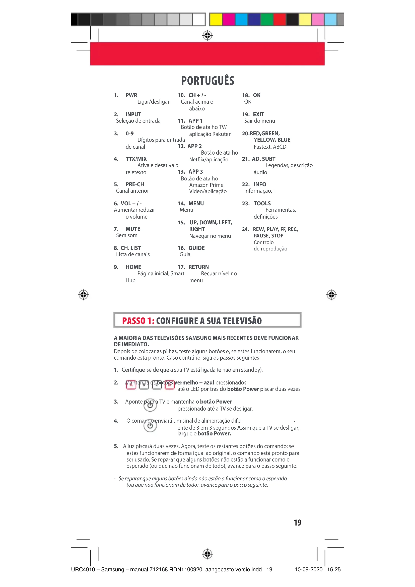 mesmo tempo até que o LED sob o botão POWER pisque duas vezes.2. Agora aponte o comando na direção da/o barra de som/dispositivo áudio e mantenha pressionado o botão com o dígito correspondente à sua marca (por exemplo, 4 para LG). O comando irá enviar a função Sem som para o seu dispositivo a cada 3 segundos.3. Assim, que a/o barra de som/dispositivo áudio desativarem o som, largue o botão do dígito. O LED sob o botão Power irá piscar duas vezes e os botões Aumentar volume, Baixar volume e Sem som deverão agora controlar a/o barra de som/dispositivo áudio.CONFIGURAÇÃO DO CÓDIGO ÁUDIO Se a/o barra de som/dispositivo áudio não for de nenhuma marca na tabela abaixo, pode congurar o comando, introduzindo um código de 4 dígitos. Os códigos aparecem listados na secção Lista de códigos áudio deste manual por ordem da marca e da popularidade. Localize a marca da/o barra de som/ dispositivo áudio nesta lista de código e siga o seguinte procedimento: CONTROLO DE VOLUME BARRA DE SOM/RECETOR ÁUDIO Dígito Marca Bose Denon Samsung / Harman/Kardon / JBL LG / JVC Marantz / Philips Onkyo Panasonic / Technics Pioneer Sony Yamaha URC4910 – Samsung – manual 712168 RDN1100920_aangepaste versie.indd 21URC4910 – Samsung – manual 712168 RDN1100920_aangepaste versie.indd 21 10-09-2020 16:2510-09-2020 16:2522