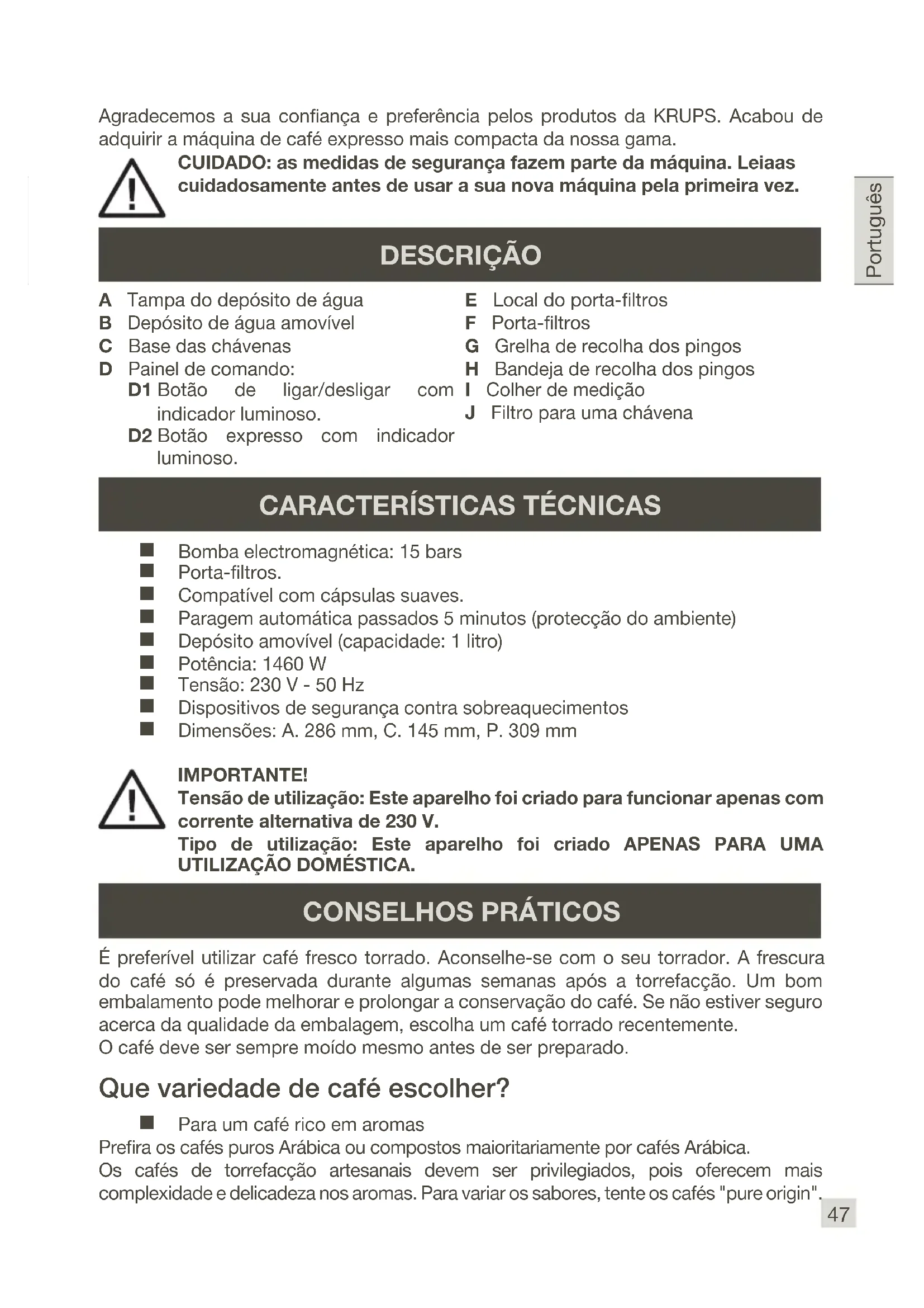 Bomba electromagnética: 15 bars Porta-ltros. Compatível com cápsulas suaves. Paragem automática passados 5 minutos (protecção do ambiente) Depósito amovível (capacidade: 1 litro) Potência: 1460 W Tensão: 230 V - 50 Hz Dispositivos de segurança contra sobreaquecimentos Dimensões: A. 286 mm, C. 145 mm, P. 309 mm IMPORTANTE! Tensão de utilização: Este aparelho foi criado para funcionar apenas com corrente alternativa de 230 V. Tipo de utilização: Este aparelho foi criado APENAS PARA UMA UTILIZAÇÃO DOMÉSTICA. Agradecemos a sua conança e preferência pelos produtos da KRUPS. Acabou de adquirir a máquina de café expresso mais compacta da nossa gama. DESCRIÇÃO