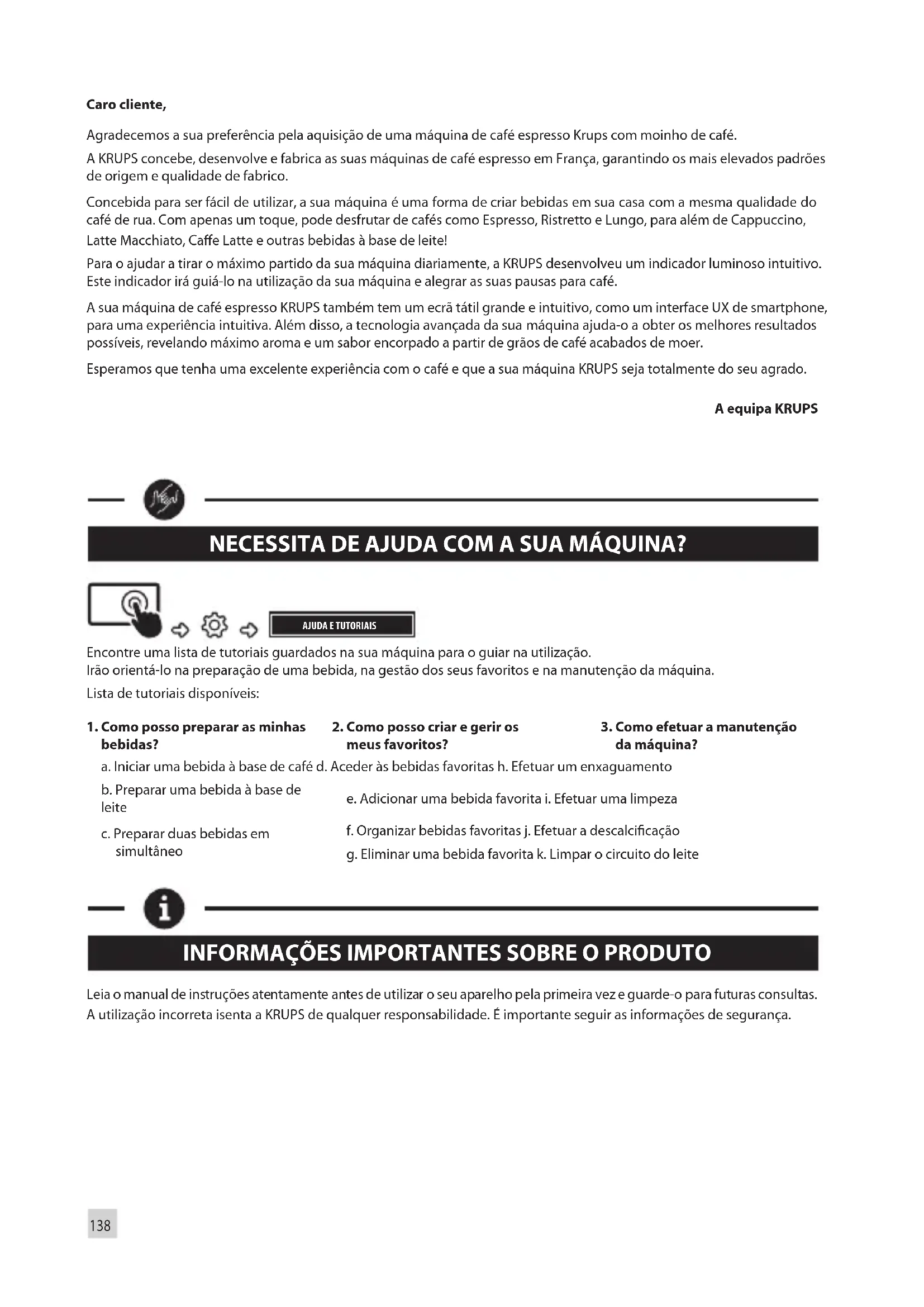 Importante: Produttore: SAS GSM - Rue Saint-Léonard F-53104 Mayenne - France138 Caro cliente, Agradecemos a sua preferência pela aquisição de uma máquina de café espresso Krups com moinho de café. A KRUPS concebe, desenvolve e fabrica as suas máquinas de café espresso em França, garantindo os mais elevados padrões de origem e qualidade de fabrico. Concebida para ser fácil de utilizar, a sua máquina é uma forma de criar bebidas em sua casa com a mesma qualidade do café de rua. Com apenas um toque, pode desfrutar de cafés como Espresso, Ristretto e Lungo, para além de Cappuccino, Latte Macchiato, Caffe Latte e outras bebidas à base de leite! Para o ajudar a tirar o máximo partido da sua máquina diariamente, a KRUPS desenvolveu um indicador luminoso intuitivo. Este indicador irá guiá-lo na utilização da sua máquina e alegrar as suas pausas para café. A sua máquina de café espresso KRUPS também tem um ecrã tátil grande e intuitivo, como um interface UX de smartphone, para uma experiência intuitiva. Além disso, a tecnologia avançada da sua máquina ajuda-o a obter os melhores resultados possíveis, revelando máximo aroma e um sabor encorpado a partir de grãos de café acabados de moer. Esperamos que tenha uma excelente experiência com o café e que a sua máquina KRUPS seja totalmente do seu agrado. A equipa KRUPS NECESSITA DE AJUDA COM A SUA MÁQUINA?