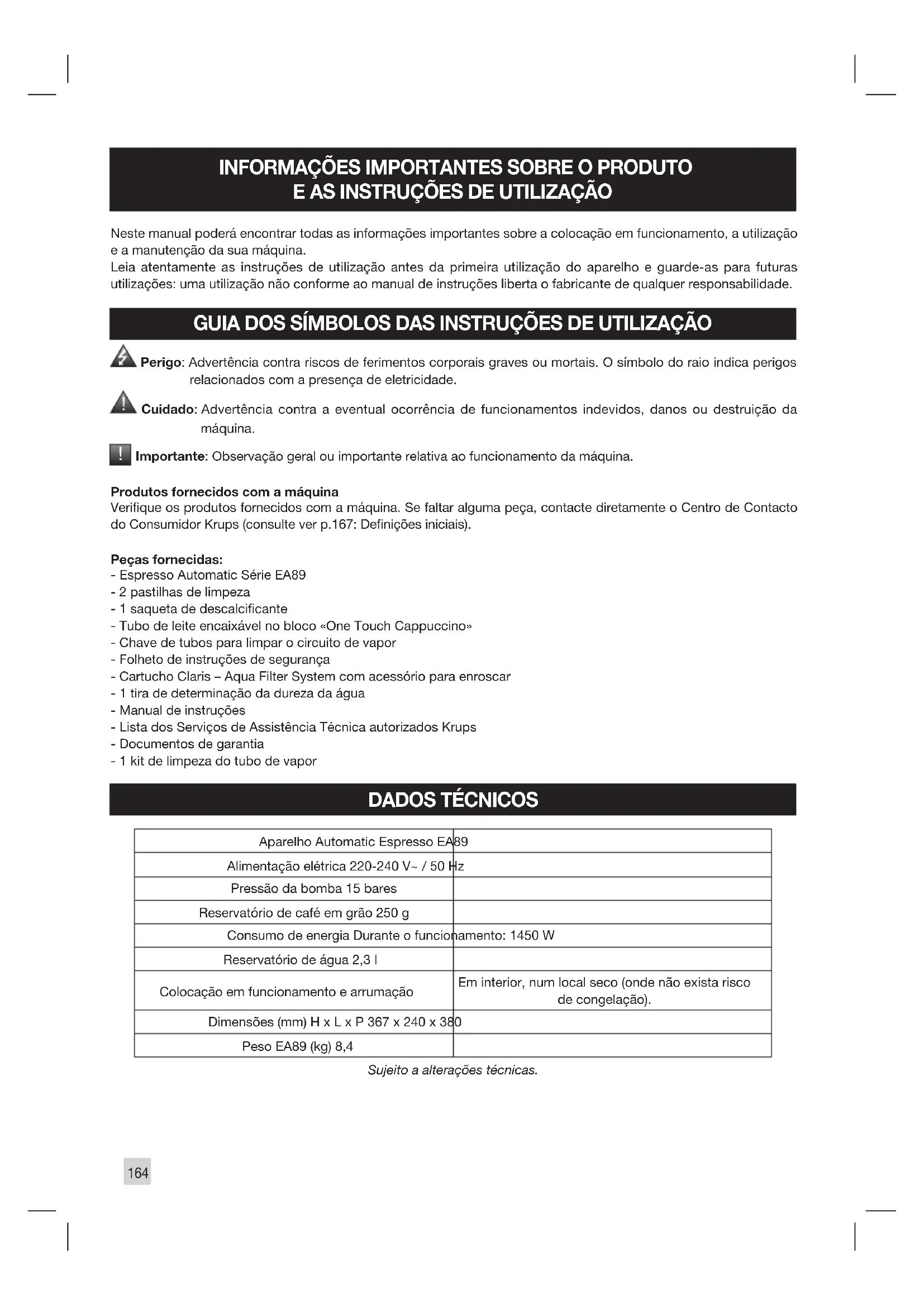 Importante: Observação geral ou importante relativa ao funcionamento da máquina. Produtos fornecidos com a máquina Verique os produtos fornecidos com a máquina. Se faltar alguma peça, contacte diretamente o Centro de Contacto do Consumidor Krups (consulte ver p.167: Denições iniciais). Peças fornecidas: - Espresso Automatic Série EA89 - 2 pastilhas de limpeza - 1 saqueta de descalcicante - Tubo de leite encaixável no bloco «One Touch Cappuccino» - Chave de tubos para limpar o circuito de vapor - Folheto de instruções de segurança - Cartucho Claris – Aqua Filter System com acessório para enroscar - 1 tira de determinação da dureza da água - Manual de instruções - Lista dos Serviços de Assistência Técnica autorizados Krups - Documentos de garantia - 1 kit de limpeza do tubo de vapor