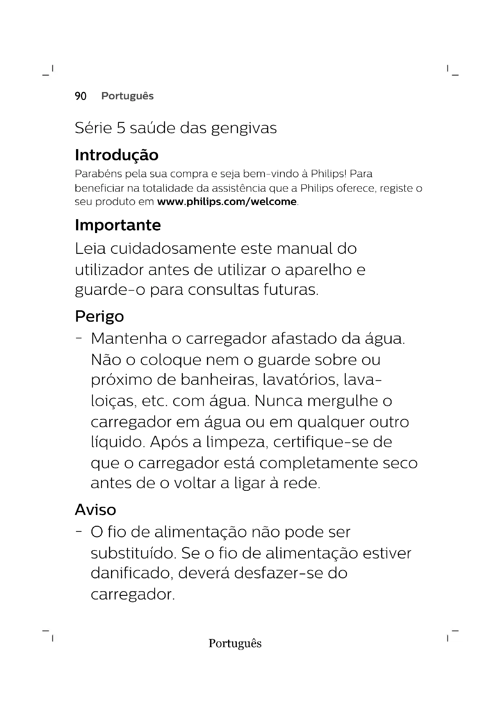 NederlandsPortuguês Série 5 saúde das gengivas Introdução Parabéns pela sua compra e seja bem-vindo à Philips! Para beneficiar na totalidade da assistência que a Philips oferece, registe o seu produto em www.philips.com/welcome. Importante Leia cuidadosamente este manual do utilizador antes de utilizar o aparelho e guarde-o para consultas futuras. Perigo