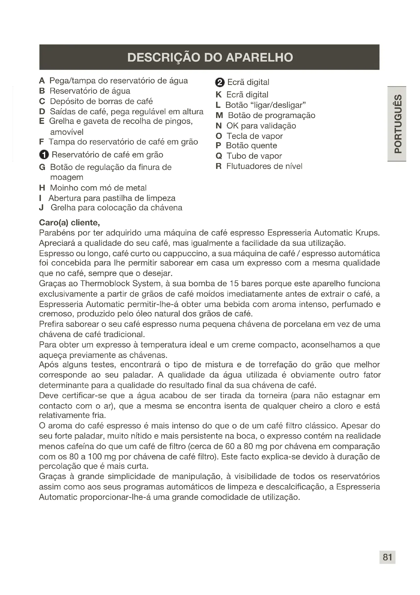 O acessório Auto- Cappuccino não aspira o leite (acessório vendido em separado). Verique se o tubo que mergulha no leite não está obstruído. Certique-se que o tubo exível não está enrolado e que se encontra corretamente encaixado no acessório por forma a evitar a entrada de ar. Depois de desligar e deixar arrefecer o aparelho, desentupa o orifício de saída do acessório Auto-Cappuccino. Após ter esvaziado o coletor de borras de café, a mensagem de aviso permanece visível no ecrã. Volte a colocar o coletor de borras de café e siga as instruções apresentadas no ecrã. Espere, pelo menos, 6 segundos antes de voltar a colocar. Ocorreu um corte de corrente no decorrer de um ciclo. O aparelho reinicializa-se automaticamente quando é ligado de novo à corrente, cando pronto para um novo ciclo. Existe água ou café por baixo do aparelho. A gaveta de recolha dos pingos transbordou: Esvazie-a e limpe o coletor de borra de café. Verique o posicionamento adequado da gaveta de recolha de pingos. Nunca retire o reservtório de água antes do nal do ciclo. Aparece a mensagem . Desligue o aparelho durante 20 segundos, retire o cartucho Claris, se for caso disso, e depois volte a ligá-lo. Se o café escoar por trás das saídas de café. No caso de persistência da falha, registe o número da falha e contacte o Centro de Contacto Consumidor da KRUPS. O aparelho funciona mas não sai nenhum líquido. Verique se o reservatório de água está colocado corretamente e se o cabo não está preso entre o corpo do aparelho e o reservatório de água. A gaveta de recolha de pingos contém café moído. Esta é produzida caso o café moído caia em redor da cuba de percolação; esta mantém a limpeza da máquina. Apresentamos em seguida algumas receitas que poderá preparar com a Espresseria Automatic : Cappuccino Para preparar um bom cappuccino, as proporções ideais são as seguintes: 1/3 de leite quente, 1/3 de café, 1/3 de espuma de leite. Caffe Latte Para esta preparação, também chamada Latte Macchiato, as proporções são as seguintes: 3/5 de leite quente, 1/5 de café, 1/5 de espuma de leite. Para estas preparações à base de leite, utilize preferencialmente leite meio gordo muito fresco (acabado de sair do frigoríco, o ideal seria entre os 6 e os 8° C). No m da receita, pode polvilhar com chocolate em pó.93 PORTUGUÊS Café com natas Prepare um espresso clássico numa chávena grande. Junte um pouco de natas para obter o café com natas. Café corretto* Prepare uma chávena de café espresso como habitualmente. Em seguida corrija ligeiramente o paladar juntando 1/4 ou 1/2 cálice de licor de conhaque. – Pode utilizar igualmente anis, aguardente, Sambuco, Kirsch ou Cointreau. – Existem igualmente inúmeras possibilidades para enriquecer o café. A imaginação não tem limites. Licor de café* Misture numa garrafa vazia de 0,75 litros, 3 chávenas de espresso, 250 g de açúcar mascavado, 1/2 litro de Conhaque ou de Kirsch. Deixe macerar a mistura durante pelo menos 2 semanas. – Obtém assim uma bebida deliciosa, sobretudo para todos os apreciadores de café. Café gelado à Italiana 4 bolas de gelado de baunilha, 2 chávenas de espresso frio açucarado, 1/8 l de leite, natas, chocolate ralado. Misture o espresso frio com o leite. Distribua bolas de gelado nos copos, verta o café em cima e decore com natas e chocolate ralado. Café à la frisonne* Junte um pequeno copo de rum a uma chávena de expresso açucarado. Decore com uma boa camada de natas e sirva. Espresso flambé* 2 chávenas de espresso, 2 pequenos copos de Conhaque, 2 colheres de café de açúcar mascavado, natas. Verta o conhaque em copos que resistam ao calor, aqueça e faça «amber». Junte o açúcar, misture, verta no café e decore com natas. Espresso perfeito* 2 chávenas de espresso, 6 gemas de ovo, 200g de açúcar, 1/8 litro de natas com açúcar, 1 cálice de licor de laranja. Bata as gemas de ovo com o açúcar até obter uma massa espessa e cremosa. Junte o espresso frio e o licor de laranja. Misture em seguida as natas batidas. Verta tudo em taças ou copos. Coloque as taças no congelador. (* : O abuso de álcool é perigoso para a saúde.)94 Αγαπητή πελάτισσα, αγαπητέ πελάτη, Σας συγχαίρουμε για την αγορά της συσκευής Espresseria Automatic Krups. Στη συσκευή αυτή θα μπορέσετε να εκτιμήσετε την ποιότητα του καφέ και ταυτόχρονα την ευκολία χρήσης της. Ανάλογα με την προτίμησή σας, espresso ή lungo, ristretto ή cappuccino, η παρούσα αυτόματη καφετιέρα είναι προγραμματισμένη έτσι ώστε να μπορέσετε στο σπίτι σας να απολαύσετε καφέ ίδιας ποιότητας, όπως στην καφετέρια οποιαδήποτε ώρα της ημέρας και οποιαδήποτε μέρα της