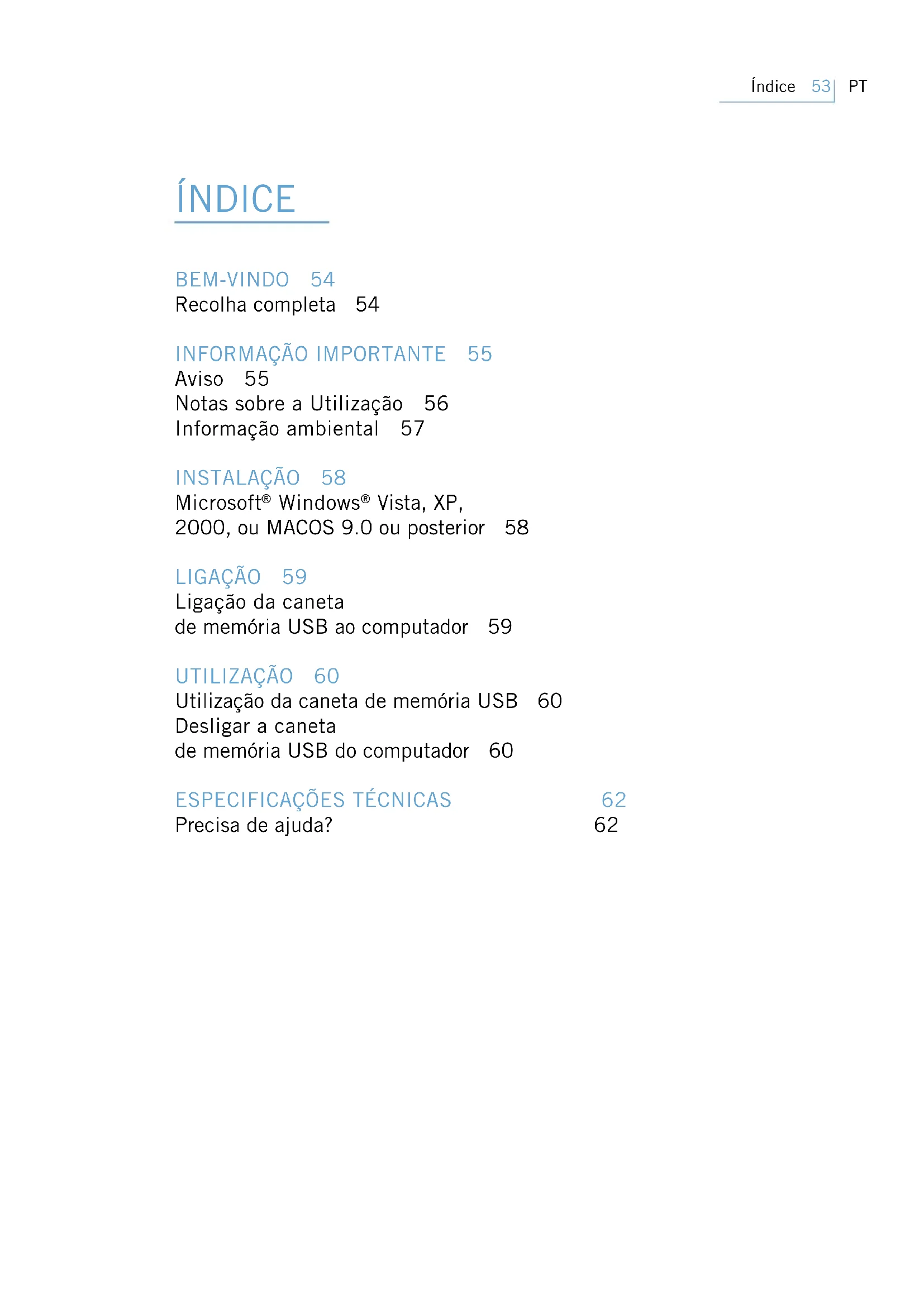 Vista, XP, 2000, ou MACOS 9.0 ou posterior 58 LIGAÇÃO 59 Ligação da caneta de memória USB ao computador 59 UTILIZAÇÃO 60 Utilização da caneta de memória USB 60 Desligar a caneta de memória USB do computador 60