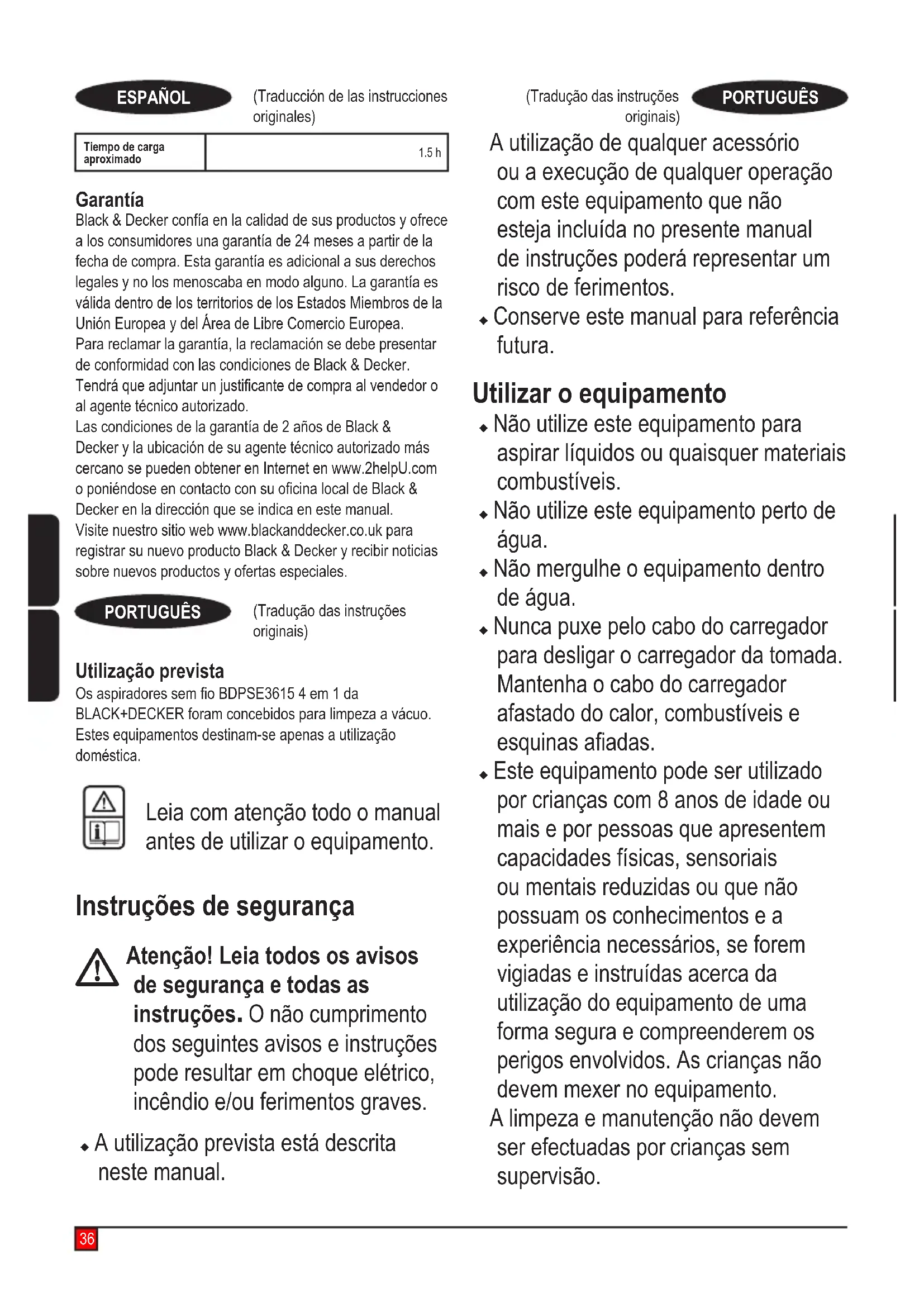 Faça uma recolha de lixo seletiva. Os produtos e as baterias assinalados com este símbolo não devem ser eliminados juntamente com o lixo doméstico normal.41 (Tradução das instruções originais)PORTUGUÊS(Översättning av originalanvisnin-garna)SVENSKAOs produtos e as baterias contêm materiais que podem ser recuperados ou reciclados, reduzindo assim a necessidade de matérias-primas.Recicle os produtos eléctricos e as baterias de acordo com as disposições locais. Estão disponíveis mais informações emwww.2helpU.comDados técnicosBDPSE3615Tensão 36Watt-horas 54Peso 3,58Bateria BL15362Carregador 90616337-01Tempo de carga aprox. 1.5 horas Garantia ABlack&Deckerconanaqualidadedosseusprodutose oferece aos clientes uma garantia de 24 meses a partir da data de compra. Esta garantia é um complemento dos seus direitos estabelecidos por lei, não os prejudicando de forma alguma. A garantia é válida nos Estados-membros da União Europeia e nos países-membros da Zona Europeia de Comércio Livre.Para acionar a garantia, esta deve estar em conformidade com os termos e condições da Black&Decker e terá de apresentar o comprovativo de compra ao vendedor ou a um técnico de reparação autorizado. Os termos e condições da garantia de 2 anos da Black&Decker e a localização do agente de reparação autorizado mais próximo podem ser obtidos na Internet emwww.2helpU.comoucontactandoumalialdaBlack&Decker, cuja morada está indicada neste manual.Visite o nosso Website www.blackanddecker.co.uk para registar o novo produto Black & Decker e manter-se atualizado relativamente a novos produtos e ofertas especiais. Avsedd användning Din BLACK+DECKER, BDPSE3615 4-i-1 sladdlösa dammsugare har designats för dammsugning. Dessa apparater är endast avsedd för hemmabruk. Läs hela den här bruksanvisnin- gen noggrant innan du börjar använda apparaten. Säkerhetsinstruktioner