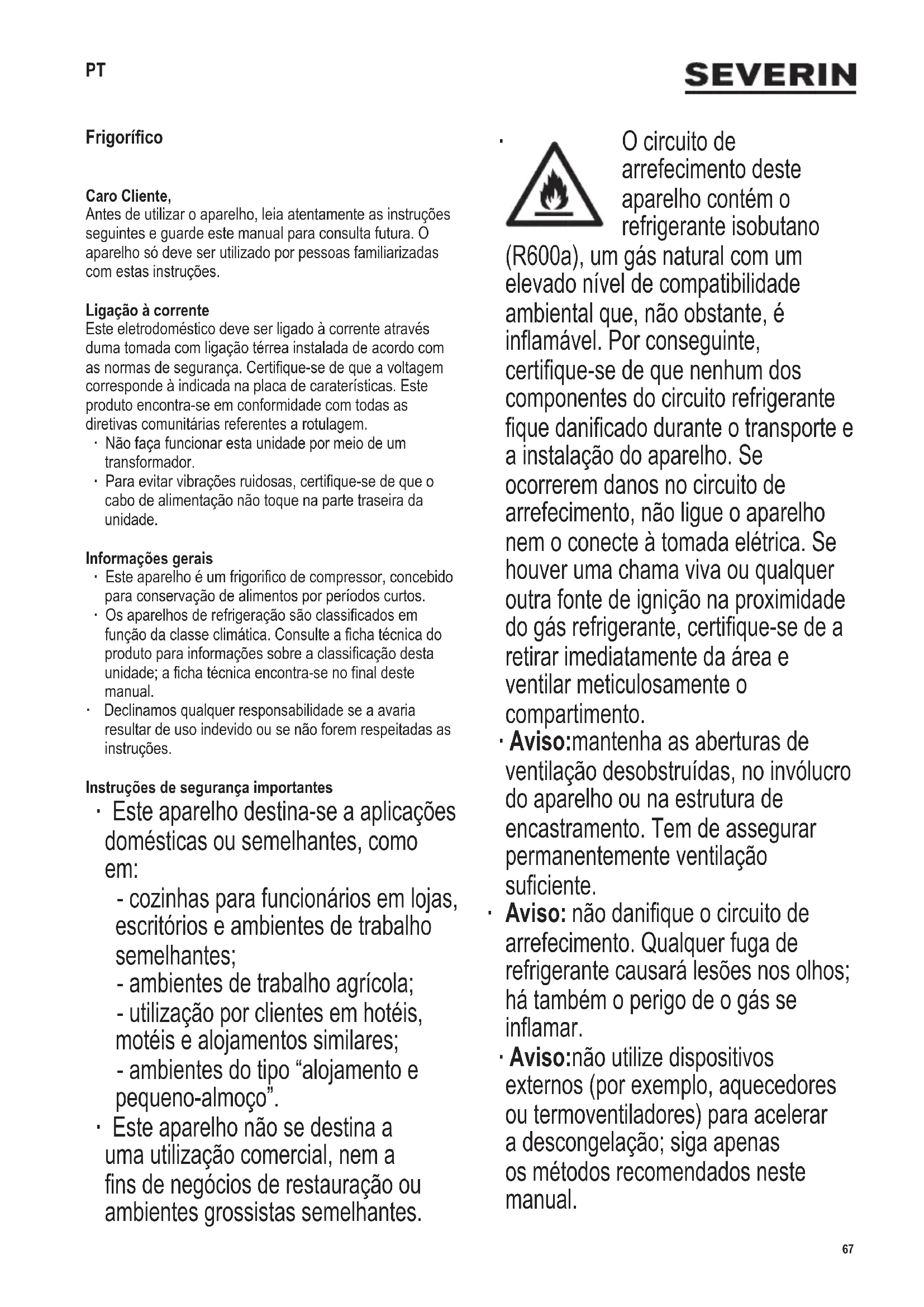 cerca de quatro horas antes de a conectar à tomada elétrica.71 142 x 208 mm Comando de temperatura ∙ A unidade ca ativada quando é conectada à tomada elétrica. Só é completamente desligada quando a cha é retirada da tomada elétrica. ∙ A temperatura do frigoríco pode ser ajustada através do comando de temperatura. ∙ Se rodar o comando no sentido horário, diminuirá a temperatura; se o rodar no sentido anti-horário, aumentá-la-á. ∙ Recomendamos que rode inicialmente o comando para uma posição média. Após algum tempo, deve vericar a temperatura real com um termómetro e ajustá-la se necessário. ∙ Após uma falha de energia, ou se tiver sido deliberadamente desligada, a unidade pode demorar de 3 a 5 minutos para voltar a ligar. ∙ Nota: na posição “0”, a função de arrefecimento cará desligada, ainda que o aparelho continue conectado à tomada elétrica. ∙ Se observar a formação de gelo na parede traseira, as causas mais prováveis são a abertura da porta por demasiado tempo, a colocação de comida quente no frigoríco ou o ajuste do comando para uma posição muito elevada. ∙ Os líquidos, alimentos com odor forte ou alimentos propensos a absorver odores fortes (por exemplo, queijo, peixe ou manteiga) devem ser conservados separadamente ou em recipientes hermeticamente fechados. ∙ A comida quente deve ser deixada a arrefecer até à temperatura ambiente antes de ser colocada no frigoríco. ∙ Certique-se sempre de que a porta que devidamente fechada e o vedante não que obstruído por alimentos guardados no compartimento ou na porta. Descongelação e limpeza ∙ Retire sempre a cha da tomada elétrica antes de limpar o aparelho. ∙ Quando o gelo acumulado atingir uma espessura de 2 mm, a unidade terá de ser descongelada. ∙ Rode o comando de temperatura para a posição “0” e deixe a porta aberta. Ponha o tabuleiro coletor na parte central traseira da prateleira de conservação. A unidade está agora a descongelar e a água resultante da fusão do gelo será recolhida na parte inferior e no tabuleiro coletor. ∙ Aviso: não utilize dispositivos externos ou outros meios (por exemplo, aquecedores ou termoventiladores) para acelerar a descongelação. ∙ Não verta água sobre a unidade ou no seu interior. ∙ Para limpezas frequentes recomendamos o uso de água morna com um pouco de detergente suave. Para evitar odores desagradáveis no interior, o frigoríco deve ser limpo cerca de uma vez por mês. ∙ Quaisquer acessórios devem ser limpos separadamente com água e detergente. Não os ponha na máquina de lavar. ∙ Não utilize abrasivos, soluções de limpeza agressivas ou agentes de limpeza que contenham álcool. ∙ Após a limpeza, enxague meticulosamente todas as superfícies com água limpa antes de as secar completamente com um pano. Antes de voltar a inserir a cha na tomada elétrica, certique-se de ter as mãos secas. ∙ Tenha o cuidado de não retirar ou danicar a placa sinalética no interior do frigoríco durante a limpeza. ∙ Para poupar energia, o compressor (na traseira) deve ser cuidadosamente limpo pelo menos duas vezes por ano com uma escova ou um aspirador. Conselhos para poupança de energia ∙ O aparelho deve ser instalado numa sala seca e bem ventilada. ∙ Não exponha o aparelho a luz solar direta, nem o posicione próximo de fontes de calor (aquecedores, fogões, etc.). Contudo, se não o puder evitar, terá de instalar isolamento adequado entre a fonte de calor e a unidade. ∙ Não cubra as aberturas de ventilação nem as grelhas e assegure uma circulação de ar suciente atrás da unidade. ∙ O compressor (na traseira) deve ser limpo periodicamente. O pó acumulado provoca o aumento do consumo de energia. ∙ A comida quente deve ser deixada a arrefecer antes de ser guardada no interior. ∙ Não deixe a porta do frigoríco aberta por demasiado tempo ao introduzir ou tirar alimentos. ∙ Não selecione uma temperatura inferior à necessária. Para informações pormenorizadas sobre o ajuste da temperatura, consulte a secção Comando de temperatura. Resolução de problemas Quando o aparelho está ligado, é possível ouvir determinados sons habituais. Tais sons são: ∙ causados pelo motor elétrico da unidade do compressor; durante o arranque do compressor, o nível do som será ligeiramente mais elevado por um período limitado. ∙ causados pelo agente frigorígeno a uir através do circuito. O quadro seguinte enumera as falhas possíveis, bem como as causas prováveis e soluções. Em caso de problemas de funcionamento, comece por vericar se existe uma solução neste quadro. Se o problema persistir, desconecte o aparelho da tomada elétrica e contacte o nosso Departamento de Assistência ao Cliente.72 142 x 208 mm Transporte do aparelho Para evitar danos na unidade durante o transporte, certique-se de que todos os acessórios e componentes no interior e em redor do aparelho estejam rmemente imobilizados. A unidade só pode ser transportada na posição vertical; não a incline mais de 30°. Uma vez posicionada a unidade, aguarde cerca de 30 minutos antes de a conectar à tomada elétrica. Se a unidade tiver sido inclinada mais de 30° durante o transporte, deixe-a car na posição vertical durante pelo menos 4 horas antes de a conectar à tomada elétrica. Conselho Os aparelhos marcados com este símbolo devem ser eliminados separadamente dos resíduos domésticos, já que contêm materiais valiosos que podem ser reciclados. A eliminação adequada protege o ambiente e a saúde humana. As suas autoridades locais ou o revendedor podem facultar-lhe informações sobre o assunto. ∙ Retire a cha da tomada elétrica e desconecte-a do aparelho antes de o eliminar. ∙ O refrigerante Isobutano (R600a) e o propelente do isolamento Ciclopentano (C5H10) são substâncias inamáveis, pelo que têm de ser eliminadas adequadamente. ∙ Certique-se de que os tubos do circuito de arrefecimento não qu
