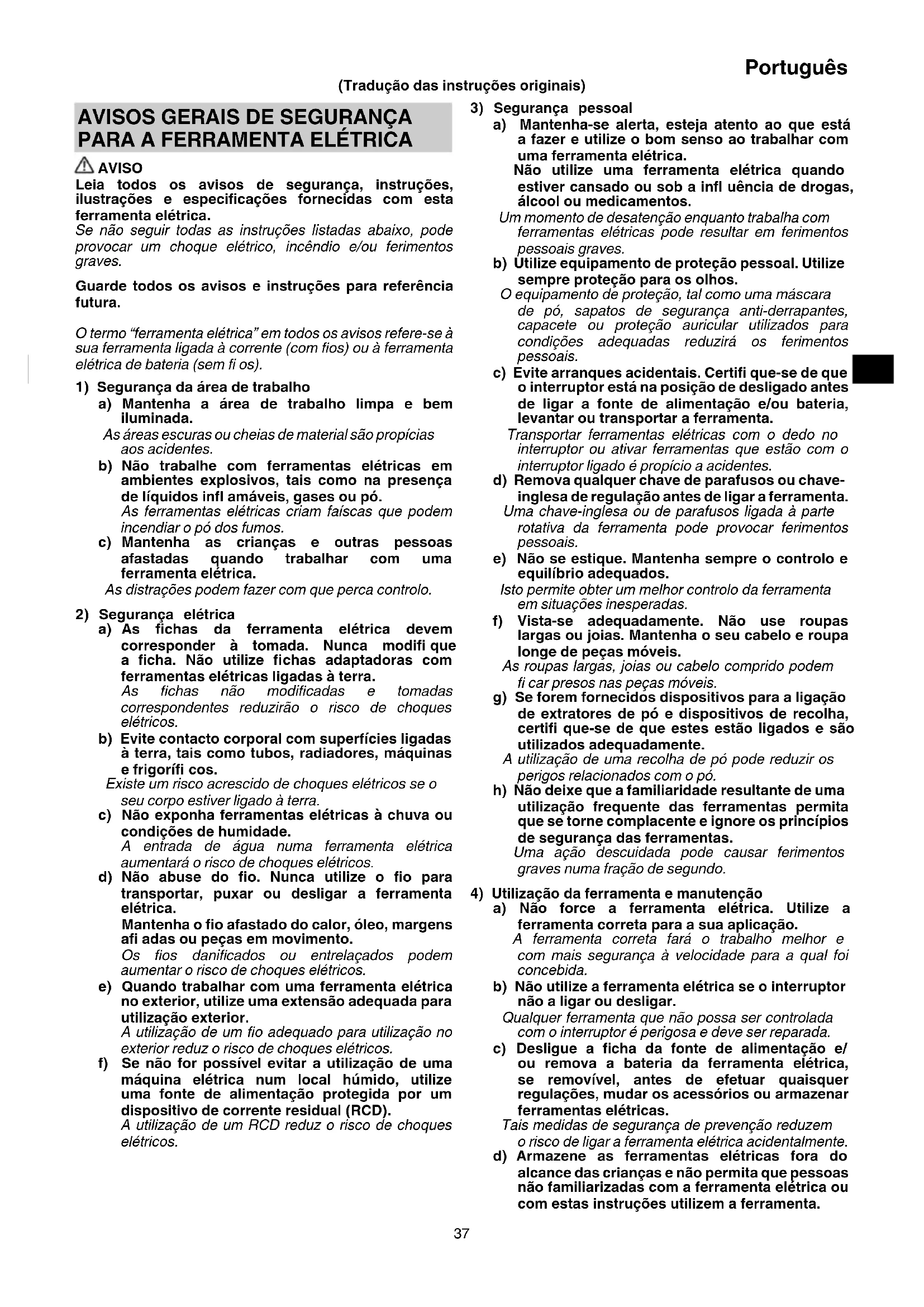 a) As fi chas da ferramenta elétrica devem corresponder à tomada. Nunca modifi que a fi cha. Não utilize fi chas adaptadoras com ferramentas elétricas ligadas à terra. As fi chas não modifi cadas e tomadas correspondentes reduzirão o risco de choques elétricos. b) Evite contacto corporal com superfícies ligadas à terra, tais como tubos, radiadores, máquinas e frigorífi cos. Existe um risco acrescido de choques elétricos se o seu corpo estiver ligado à terra. c) Não exponha ferramentas elétricas à chuva ou condições de humidade. A entrada de água numa ferramenta elétrica aumentará o risco de choques elétricos. d) Não abuse do fi o. Nunca utilize o fi o para transportar, puxar ou desligar a ferramenta elétrica. Mantenha o fi o afastado do calor, óleo, margens afi adas ou peças em movimento. Os fi os danifi cados ou entrelaçados podem aumentar o risco de choques elétricos. e) Quando trabalhar com uma ferramenta elétrica no exterior, utilize uma extensão adequada para utilização exterior. A utilização de um fi o adequado para utilização no exterior reduz o risco de choques elétricos. f) Se não for possível evitar a utilização de uma máquina elétrica num local húmido, utilize uma fonte de alimentação protegida por um dispositivo de corrente residual (RCD). A utilização de um RCD reduz o risco de choques elétricos. (Tradução das instruções originais) 00BookDB3DL2.indb3700BookDB3DL2.indb37 2019/04/0917:37:332019/04/0917:37:3338 Português As ferramentas elétricas são perigosas nas mãos de utilizadores inexperientes. e) Efetue a manutenção das ferramentas elétricas e acessórios. Verifi que a existência de desalinhamentos ou dobragens das peças móveis, quebras de peças e quaisquer outras condições que possam afetar o funcionamento da ferramenta elétrica. Se danifi cada, mande reparar a ferramenta antes de utilizar. Muitos acidentes são causados por ferramentas com má manutenção. f) Mantenha as ferramentas de corte afi adas e limpas. As ferramentas de corte com uma manutenção adequada e extremidades afi adas são menos propensas a dobrar e mais fáceis de controlar. g) Utilize a ferramenta elétrica, acessórios e brocas de ferramentas, etc., de acordo com estas instruções, tendo em consideração as condições de trabalho e o trabalho a ser efetuado. A utilização de uma ferramenta elétrica para operações diferentes das previstas pode resultar numa situação perigosa. h) Mantenha as pegas e as superfícies de manuseamento secas, limpas e livres de óleo e graxa. Pegas de manuseamento escorregadias não permitem a manipulação segura e controlo da ferramenta em situações inesperadas.