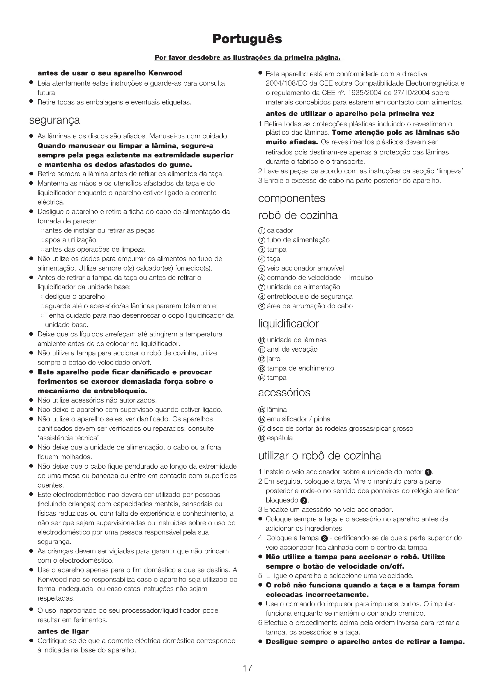 Use o aparelho apenas para o fim doméstico a que se destina. A Kenwood não se responsabiliza caso o aparelho seja utilizado de forma inadequada, ou caso estas instruções não sejam respeitadas.