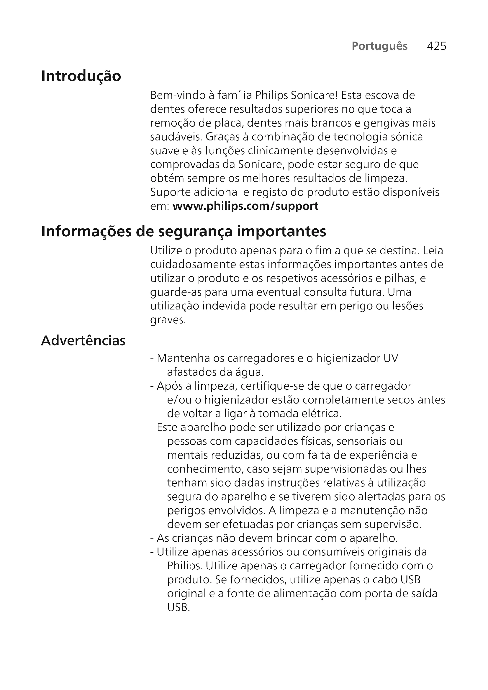 Português Introdução Bem-vindo à família Philips Sonicare! Esta escova de dentes oferece resultados superiores no que toca a remoção de placa, dentes mais brancos e gengivas mais saudáveis. Graças à combinação de tecnologia sónica suave e às funções clinicamente desenvolvidas e comprovadas da Sonicare, pode estar seguro de que obtém sempre os melhores resultados de limpeza. Suporte adicional e registo do produto estão disponíveis em: www.philips.com/support Informações de segurança importantes Utilize o produto apenas para o fim a que se destina. Leia cuidadosamente estas informações importantes antes de utilizar o produto e os respetivos acessórios e pilhas, e guarde-as para uma eventual consulta futura. Uma utilização indevida pode resultar em perigo ou lesões graves. Advertências - Mantenha os carregadores e o higienizador UV afastados da água. - Após a limpeza, certifique-se de que o carregador e/ou o higienizador estão completamente secos antes de voltar a ligar à tomada elétrica. - Este aparelho pode ser utilizado por crianças e pessoas com capacidades físicas, sensoriais ou mentais reduzidas, ou com falta de experiência e conhecimento, caso sejam supervisionadas ou lhes tenham sido dadas instruções relativas à utilização segura do aparelho e se tiverem sido alertadas para os perigos envolvidos. A limpeza e a manutenção não devem ser efetuadas por crianças sem supervisão. - As crianças não devem brincar com o aparelho. - Utilize apenas acessórios ou consumíveis originais da Philips. Utilize apenas o carregador fornecido com o produto. Se fornecidos, utilize apenas o cabo USB original e a fonte de alimentação com porta de saída USB.426 Português - Este aparelho não contém peças passíveis de assistência pelo utilizador. Se o aparelho estiver danificado, não o utilize e contacte o Centro de Apoio ao Cliente no seu país. Apenas para dispositivos com cabo: Se o cabo estiver danificado, substitua o carregador com higienizador por um novo. - Não utilize o carregador e/ou o higienizador ao ar livre nem junto de superfícies aquecidas. - Não lave nenhuma das peças do produto na máquina de lavar a loiça. - Este aparelho destina-se unicamente à lavagem dos dentes, gengivas e língua. - Mantenha sempre o higienizador fora do alcance das crianças. - Pare de utilizar o higienizador se a lâmpada UV permanecer acesa quando a porta está aberta. A luz UV pode ser prejudicial para os olhos e a pele humana. - Utilize apenas o higienizador com a estrutura de proteção colocada. - Não toque na lâmpada UV do higienizador UV enquanto esta estiver quente. - Interrompa a utilização da cabeça de escovagem se esta apresentar cerdas esmagadas ou dobradas. Substitua a cabeça de escovagem de 3 em 3 meses ou mais cedo no caso de aparecerem sinais de desgaste. - Evite o contacto direto com produtos que contenham óleos essenciais ou óleo de coco. Um contacto deste tipo pode resultar no deslocamento das cerdas. - Não utilize o aparelho e consulte o seu dentista/médico se ocorrer uma hemorragia excessiva após a utilização, se o sangramento continuar a ocorrer após 1 semana de utilização ou se sentir desconforto ou dor. - Se tiver sido submetido a uma cirurgia oral ou das gengivas nos últimos 2 meses, consulte o seu dentista antes de utilizar este aparelho. - Se tiver um pacemaker ou outro dispositivo implantado, consulte o seu médico ou o fabricante do dispositivo implantado antes da utilização.427 Português - Se tiver problemas de saúde, consulte o seu médico antes de utilizar este aparelho. - Este aparelho é um dispositivo de uso pessoal, pelo que não deve ser usado em vários pacientes em consultórios ou clínicas dentárias. Instruções de segurança relativas às pilhas - Este aparelho contém pilhas recarregáveis que só podem ser substituídas por técnicos qualificados. - Utilize o produto apenas para o fim a que se destina. Leia cuidadosamente estas informações antes de utilizar o produto e os respetivos acessórios e baterias, e guarde-as para uma eventual consulta futura. Uma utilização indevida pode resultar em perigo ou lesões graves. Os acessórios fornecidos podem variar consoante os produtos. - Utilize apenas acessórios e consumíveis originais da Philips. Utilize apenas uma unidade de alimentação amovível TCBxxxx, HX6100, HX6110, HX6160 ou WAAxxxx. - Mantenha o produto e as pilhas afastados de fonte de calor, e não os exponha à luz solar direta nem a altas temperaturas. - Se o produto aquecer anormalmente ou emanar um odor desagradável, mudar de cor ou o tempo de carregamento for muito superior ao habitual, não utilize nem carregue o produto e contacte a Philips. - Não coloque os produtos e as respetivas pilhas em fornos de micro-ondas ou placas de indução. - Para impedir que as pilhas aqueçam ou libertem substâncias tóxicas ou perigosas, não abra, modifique, perfure, danifique ou desmonte o produto ou a bateria. Não cause curto-circuitos, não carregue excessivamente nem inverta a corrente das pilhas. - Este aparelho contém baterias que não são substituíveis. Quando a bateria se esgotar, o aparelho deve ser eliminado em conformidade. Consulte a secção sobre reciclagem. - Se as pilhas estiverem danificadas ou com fugas, evite o contacto com a pele ou os olhos. Caso isto ocorra, lave imediatamente com água e procure assistência médica.428 Português - Quando manusear pilhas, certifique-se de que as suas mãos, o produto e as pilhas estão secos. - Para evitar um curto-circuito acidental das pilhas após a respetiva remoção, evite o contacto dos respetivos terminais com objetos metálicos (por exemplo, moedas, ganchos de cabelo, anéis). Não envolva as pilhas em folhas de alumínio. Isole os terminais das pilhas ou coloque-as num saco de plástico antes de as descartar. - Carregue e utilize o produto a uma temperatura entre 0°C e 40°C. Condições de armazenamento e tra