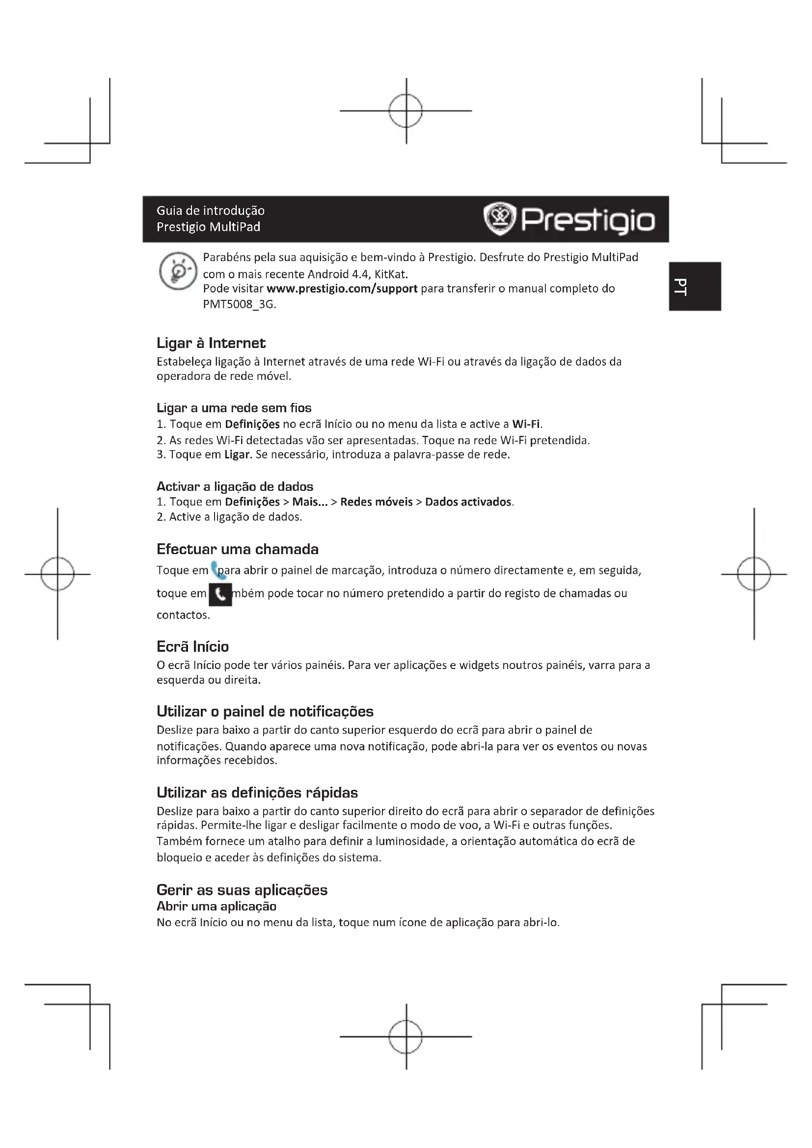 Efectuar uma chamada Toque em para abrir o painel de marcação, introduza o número directamente e, em seguida, toque em . Também pode tocar no número pretendido a partir do registo de chamadas ou contactos. Ecrã Início O ecrã Início pode ter vários painéis. Para ver aplicações e widgets noutros painéis, varra para a esquerda ou direita. Utilizar o painel de notificações Deslize para baixo a partir do canto superior esquerdo do ecrã para abrir o painel de notificações. Quando aparece uma nova notificação, pode abri-la para ver os eventos ou novas informações recebidos. Utilizar as definições rápidas Deslize para baixo a partir do canto superior direito do ecrã para abrir o separador de definições rápidas. Permite-lhe ligar e desligar facilmente o modo de voo, a Wi-Fi e outras funções. Também fornece um atalho para definir a luminosidade, a orientação automática do ecrã de bloqueio e aceder às definições do sistema. Gerir as suas aplicações Abrir uma aplicação No ecrã Início ou no menu da lista, toque num ícone de aplicação para abri-lo.PT Guia de introdução Prestigio MultiPad Adicionar um ícone de aplicação ao ecrã Início No menu da lista, toque e mantenha premida a aplicação e arraste-a para o local adequado no ecrã Início. Remover uma aplicação Toque e mantenha premida a aplicação, arraste-a para o ícone de remoção na parte superior e liberte-a depois do ícone aparecer a vermelho. Criar uma pasta Combine vários ícones de aplicação em conjunto arrastando uma aplicação para cima de outra. Uma vez que os produtos da Prestigio estão sempre a ser melhorados e actualizados, o software e o hardware do seu dispositivo podem ter um aspecto ou um funcionamento ligeiramente diferentes dos apresentados no Guia de introdução. A Prestigio informa que este Multipad está em conformidade com os requisitos básicos e outras regulamentações relevantes indicadas na directiva UE 1999/5/CE. A versão completa da declaração de conformidade está disponível em: www.prestigio.com/certificates. Para evitar possíveis danos auditivos, não ouça a níveis de volume elevados durante períodos prolongados. Para obter as informações de SAR (taxa de absorção específica), vá para: www.prestigio.com/catalogue/MultiPads/Multipad_MUZE_5008_3GRO Scurt ghid de utilizare Prestigio MultiPad Felicitari pentru achizitie si bine ati venit la Prestigio. Bucurati-va de Prestigio MultiPad cu cea mai noua varianta de Android 4.4, KitKat. Puteti vizita www.prestigio.com/support pentru a descarca versiunea completa a manualului PMT5008_3G. Conectare la Internet Conectati-va la Internet prin reteaua Wi-Fi sau prin intermediul operatorului mobil. Conectare la reteaua wireless