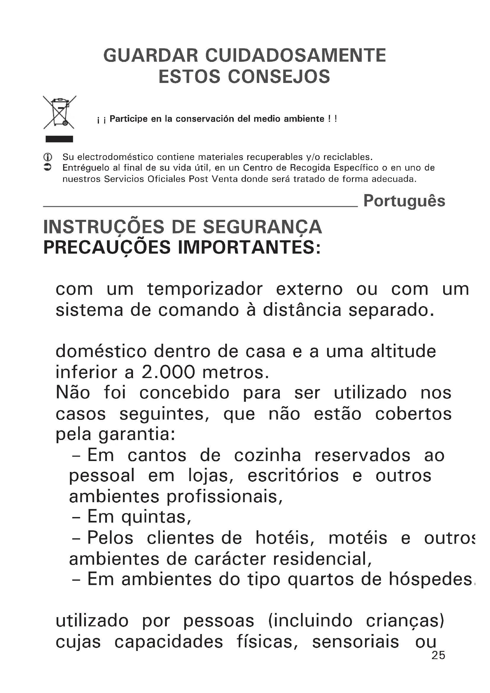PRECAUÇÕES IMPORTANTES: Este aparelho não foi concebido para funcionar com um temporizador externo ou com um sistema de comando à distância separado. O seu aparelho destina-se apenas a um uso doméstico dentro de casa e a uma altitude inferior a 2.000 metros. Não foi concebido para ser utilizado nos casos seguintes, que não estão cobertos pela garantia: – Em cantos de cozinha reservados ao pessoal em lojas, escritórios e outros ambientes profissionais, – Em quintas, – Pelos clientes de hotéis, motéis e outros ambientes de carácter residencial, – Em ambientes do tipo quartos de hóspedes. Este aparelho não foi concebido para ser utilizado por pessoas (incluindo crianças) cujas capacidades físicas, sensoriais ou Português26 mentais se encontram reduzidas, ou por pessoas com falta de experiência ou conhecimento, a não ser que tenham sido devidamente acompanhadas e instruídas sobre a correcta utilização do aparelho, pela pessoa responsável pela sua segurança. É importante vigiar as crianças por forma a garantir que as mesmas não brinquem com o aparelho. Se o cabo de alimentação estiver danificado, deve ser substituído pelo fabricante, por um Serviço de Assistência Técnica autorizado ou por pessoas de qualificação semelhante, por forma a evitar qualquer situação de perigo para o utilizador. O pão pode queimar. Por este motivo, o aparelho não deve ser utilizado na proximidade ou por cima de cortinados ou de outros materiais combustíveis (prateleiras, móveis...). O aparelho pode ser usado por crianças com mais de 8 anos de idade e por pessoas com capacidades físicas, sensoriais e mentais reduzidas ou falta de experiência e conhecimentos se tiverem recebido supervisão ou instruções relativamente ao uso do aparelho de forma de segurança e compreendam os perigos envolvidos. As crianças não podem brincar com o aparelho. A limpeza e manutenção realizada27 pelo utilizador não pode ser efectuada por crianças, a menos que estas tenham mais de 8 anos e sejam supervisionadas. Mantenha o aparelho e o respectivo cabo de alimentação fora do alcançe de crianças com menos de 8 anos de idade. Utilizar um pano para limpar as partes em contacto com o pão. Retirar regularmente as migalhas, despejando o compartimento de recolha de migalhas situado na parte inferior da torradeira.