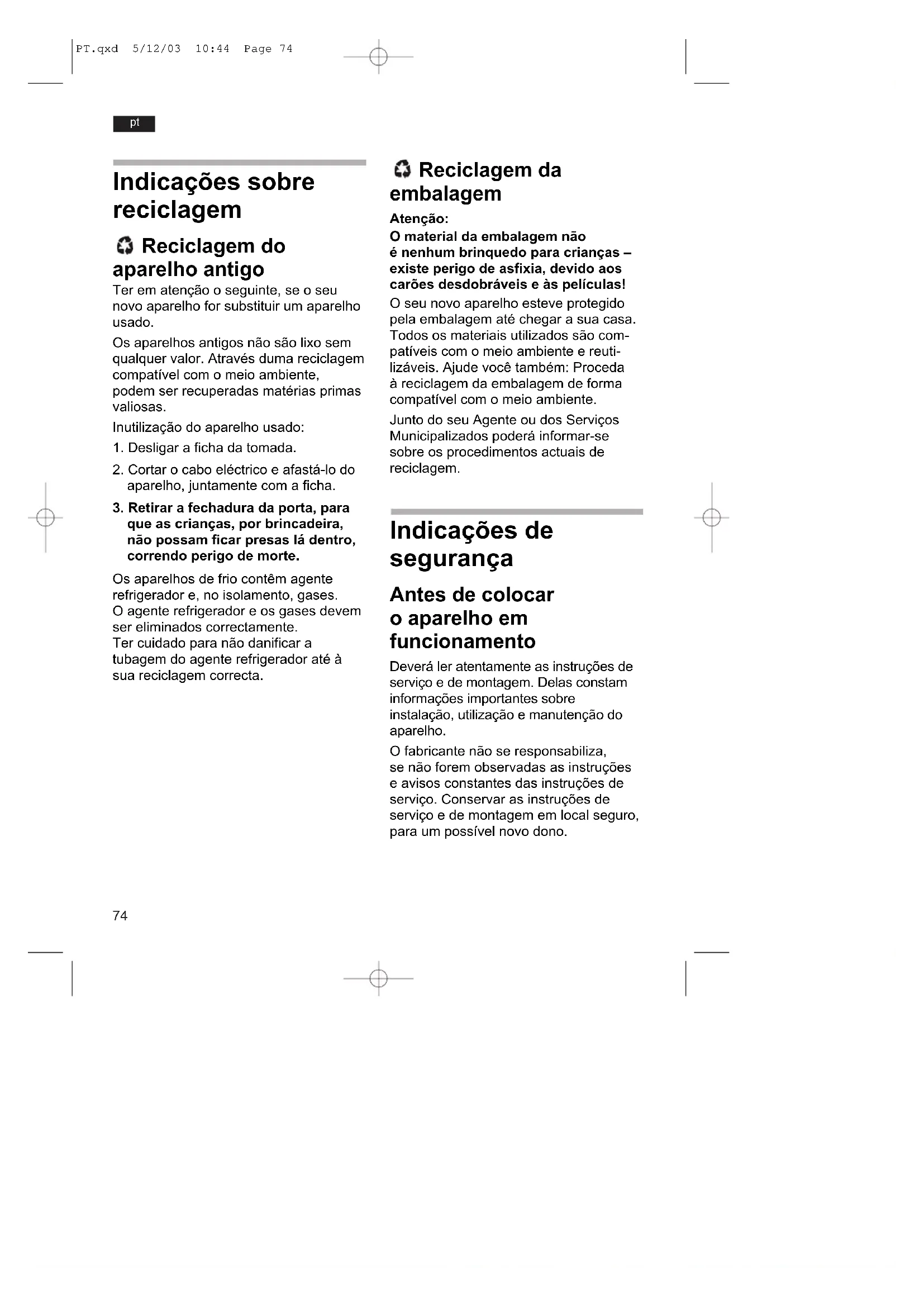 que as crianças, por brincadeira, não possam ficar presas lá dentro, correndo perigo de morte. Os aparelhos de frio contêm agente refrigerador e, no isolamento, gases. O agente refrigerador e os gases devem ser eliminados correctamente. Ter cuidado para não danificar a tubagem do agente refrigerador até à sua reciclagem correcta. Reciclagem da embalagem Atenção: O material da embalagem não é nenhum brinquedo para crianças – existe perigo de asfixia, devido aos carões desdobráveis e às películas! O seu novo aparelho esteve protegido pela embalagem até chegar a sua casa. Todos os materiais utilizados são com- patíveis com o meio ambiente e reuti- lizáveis. Ajude você também: Proceda à reciclagem da embalagem de forma compatível com o meio ambiente. Junto do seu Agente ou dos Serviços Municipalizados poderá informar-se sobre os procedimentos actuais de reciclagem. Indicações de segurança Antes de colocar o aparelho em funcionamento Deverá ler atentamente as instruções de serviço e de montagem. Delas constam informações importantes sobre instalação, utilização e manutenção do aparelho. O fabricante não se responsabiliza, se não forem observadas as instruções e avisos constantes das instruções de serviço. Conservar as instruções de serviço e de montagem em local seguro, para um possível novo dono. PT.qxd 5/12/03 10:44 Page 7475