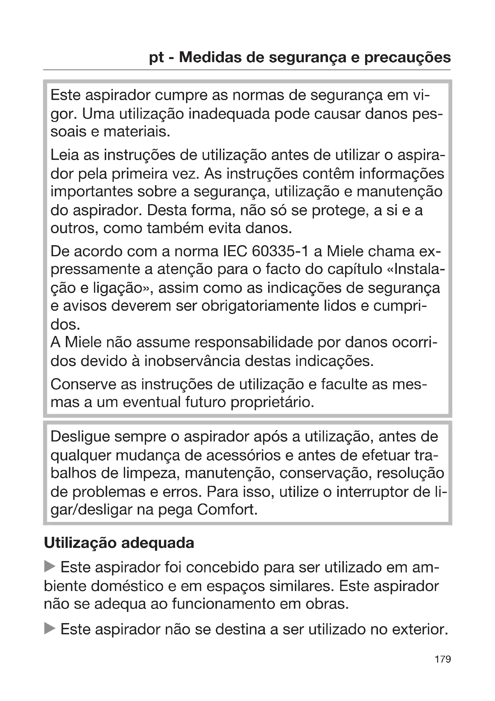 Este aspirador cumpre as normas de segurança em vi- gor. Uma utilização inadequada pode causar danos pes- soais e materiais. Leia as instruções de utilização antes de utilizar o aspira- dor pela primeira vez. As instruções contêm informações importantes sobre a segurança, utilização e manutenção do aspirador. Desta forma, não só se protege, a si e a outros, como também evita danos. De acordo com a norma IEC60335-1 a Miele chama ex- pressamente a atenção para o facto do capítulo «Instala- ção e ligação», assim como as indicações de segurança e avisos deverem ser obrigatoriamente lidos e cumpri- dos. A Miele não assume responsabilidade por danos ocorri- dos devido à inobservância destas indicações. Conserve as instruções de utilização e faculte as mes- mas a um eventual futuro proprietário. Desligue sempre o aspirador após a utilização, antes de qualquer mudança de acessórios e antes de efetuar tra- balhos de limpeza, manutenção, conservação, resolução de problemas e erros. Para isso, utilize o interruptor de li- gar/desligar na pega Comfort. Utilização adequada Este aspirador foi concebido para ser utilizado em am- biente doméstico e em espaços similares. Este aspirador não se adequa ao funcionamento em obras. Este aspirador não se destina a ser utilizado no exterior.pt - Medidas de segurança e precauções