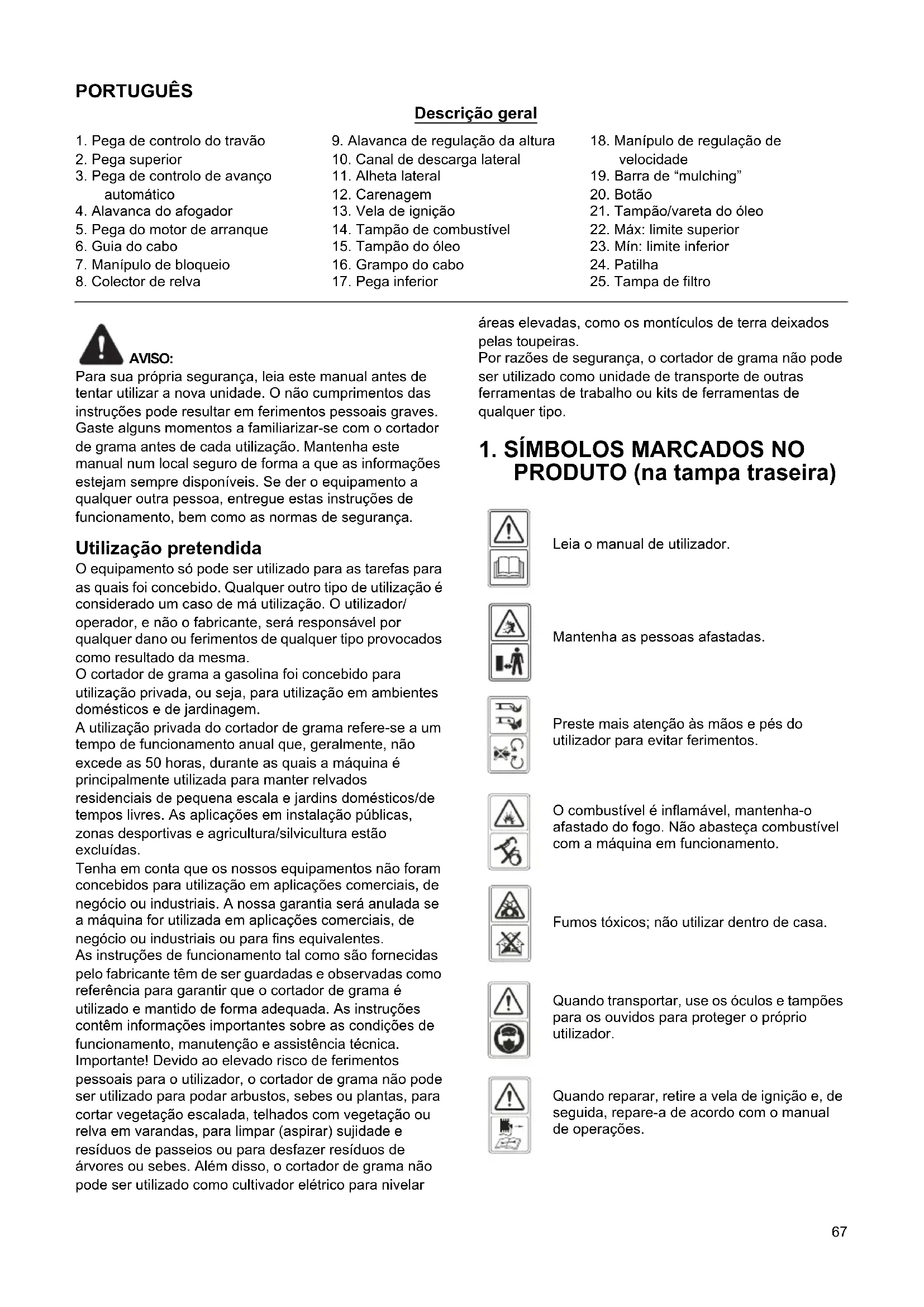 Leia o manual de utilizador. Mantenha as pessoas afastadas. Preste mais atenção às mãos e pés do utilizador para evitar ferimentos. O combustível é inflamável, mantenha-o afastado do fogo. Não abasteça combustível com a máquina em funcionamento. Fumos tóxicos; não utilizar dentro de casa. Quando transportar, use os óculos e tampões para os ouvidos para proteger o próprio utilizador. Quando reparar, retire a vela de ignição e, de seguida, repare-a de acordo com o manual de operações.68