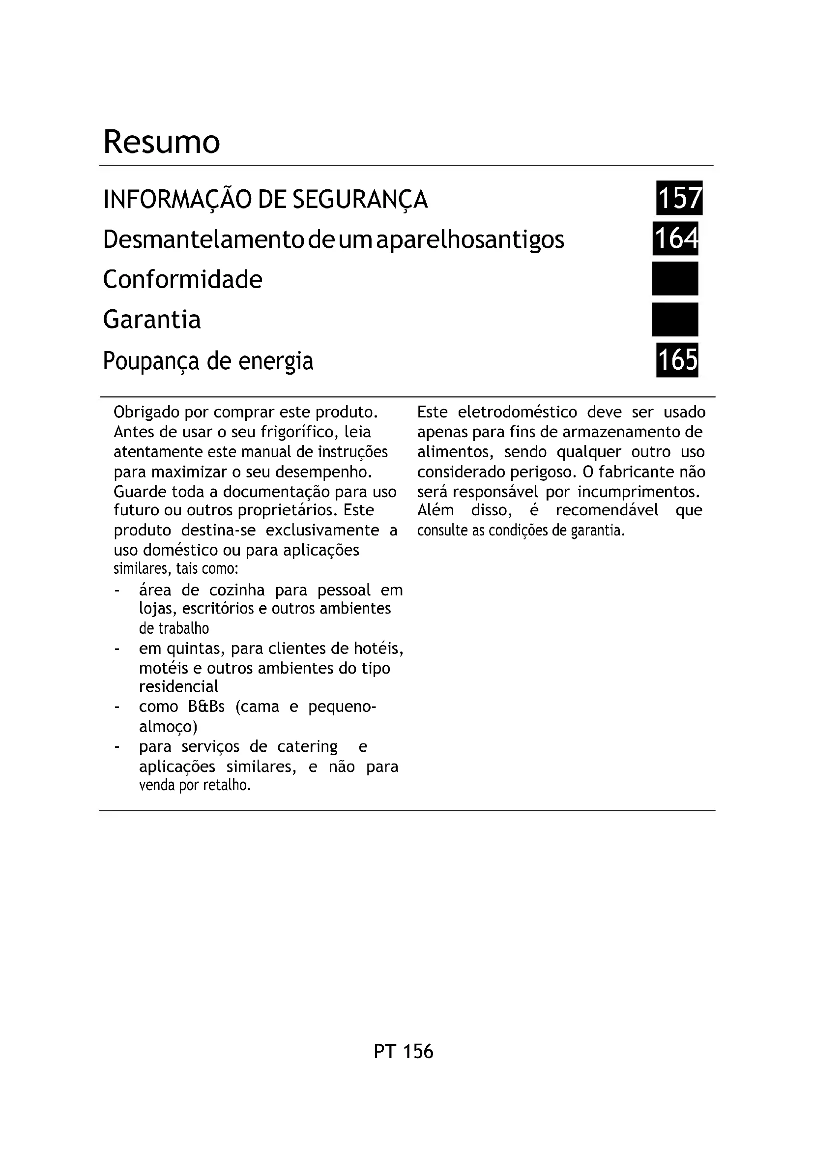 para serviços de catering e aplicações similares, e não para venda por retalho. Este eletrodoméstico deve ser usado apenas para fins de armazenamento de alimentos, sendo qualquer outro uso considerado perigoso. O fabricante não será responsável por incumprimentos. Além disso, é recomendável que consulte as condições de garantia.PT 157