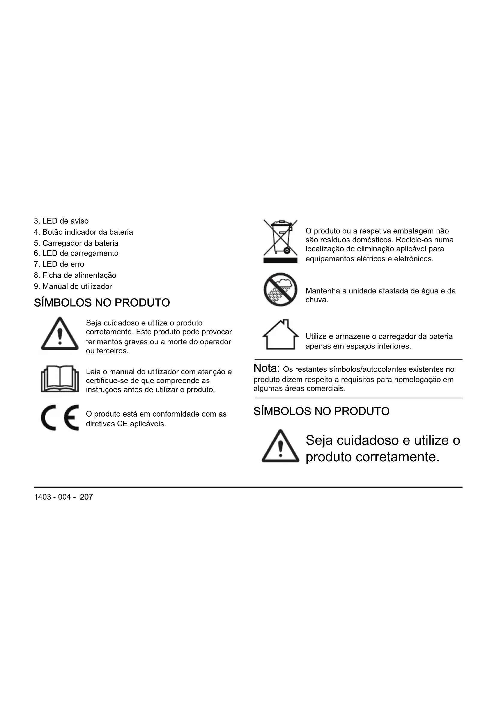 Seja cuidadoso e utilize o produto corretamente. 1403 - 004 - 207Este produto pode provocar ferimentos graves ou a morte do utilizador ou terceiros. Leia o manual do utilizador com atenção e certifique-se de que compreende as instruções antes de utilizar o produto. Mantenha a unidade afastada de água e da chuva. Utilize e armazene o carregador da bateria apenas em espaços interiores. Nota: Os restantes símbolos/ autocolantes existentes no produto dizem respeito a requisitos para homologação em algumas áreas comerciais.