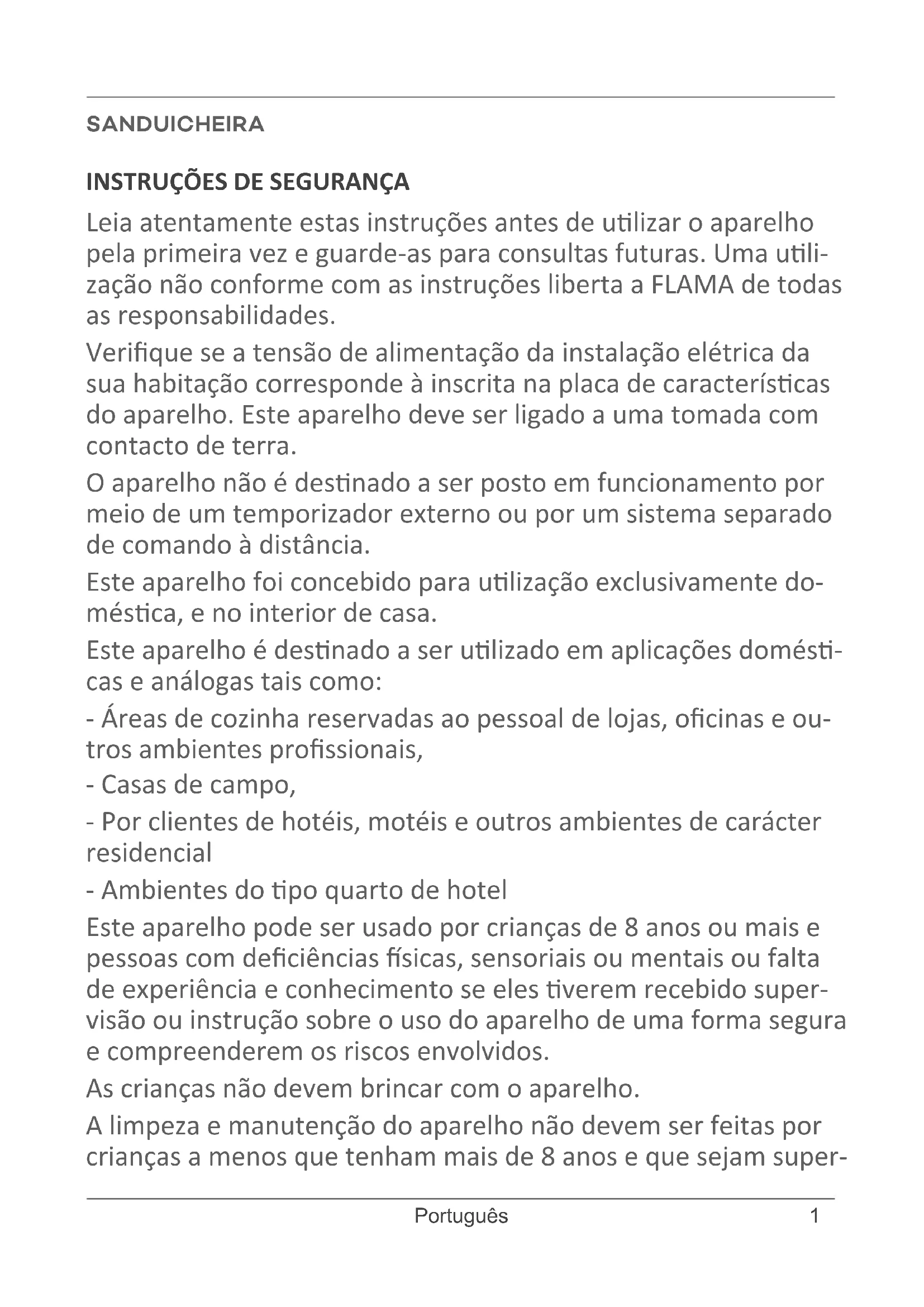 Leia atentamente estas instruções antes de ulizar o aparelho pela primeira vez e guarde-as para consultas futuras. Uma uli- zação não conforme com as instruções liberta a FLAMA de todas as responsabilidades. Verique se a tensão de alimentação da instalação elétrica da sua habitação corresponde à inscrita na placa de caracteríscas do aparelho. Este aparelho deve ser ligado a uma tomada com contacto de terra. O aparelho não é desnado a ser posto em funcionamento por meio de um temporizador externo ou por um sistema separado de comando à distância. Este aparelho foi concebido para ulização exclusivamente do- mésca, e no interior de casa. Este aparelho é desnado a ser ulizado em aplicações domés- cas e análogas tais como: - Áreas de cozinha reservadas ao pessoal de lojas, ocinas e ou- tros ambientes prossionais, - Casas de campo, - Por clientes de hotéis, motéis e outros ambientes de carácter residencial - Ambientes do po quarto de hotel Este aparelho pode ser usado por crianças de 8 anos ou mais e pessoas com deciências sicas, sensoriais ou mentais ou falta de experiência e conhecimento se eles verem recebido super- visão ou instrução sobre o uso do aparelho de uma forma segura e compreenderem os riscos envolvidos. As crianças não devem brincar com o aparelho. A limpeza e manutenção do aparelho não devem ser feitas por crianças a menos que tenham mais de 8 anos e que sejam super- SANDUICHEIRA2 www.ama.pt visionadas. Mantenha o aparelho e o cabo de alimentação fora do alcance das crianças menores de 8 anos. Aviso - A temperatura das supercies acessíveis poderá ser ele- vada quando o aparelho se encontra em funcionamento. Desligue o aparelho da alimentação removendo a cha da to- mada de corrente após cada ulização e aquando da limpeza. Deixe-o arrefecer antes de proceder a qualquer operação de lim- peza ou de arrumação. Antes de ligar o aparelho, cerque-se que o coloca numa su- percie plana, estável e horizontal. Não ulize o aparelho se o cabo de alimentação ou a cha se en- contrarem danicados, mande-os substuir imediatamente num Serviço de Assistência Técnica Autorizado FLAMA. Se o cabo de alimentação se danicar, deve ser substuído pelo fabricante, pelo seu serviço pós-venda ou pessoal de qualica- ção similar de forma a evitar um perigo. O aparelho nunca deve ser ulizado perto de materiais inamá- veis ou combusveis. Nunca deixe o aparelho sem vigilância. Não tape o aparelho durante o seu funcionamento. Não desmonte o aparelho. O aparelho só deve ser ulizado para cozinhar alimentos. A sua ulização para outros ns poderá provocar danos irreparáveis. Nunca mergulhe o aparelho em água ou qualquer outro líquido. AVISO: Carvão ou outros combusveis não devem ser ulizados com este aparelho. Este produto cumpre as Direvas de Compabilidade Eletro- magnéca e de Baixa Tensão. Este manual de instruções também está disponível no formato PDF em www.ama.pt.3 Português DESCRIÇÃO