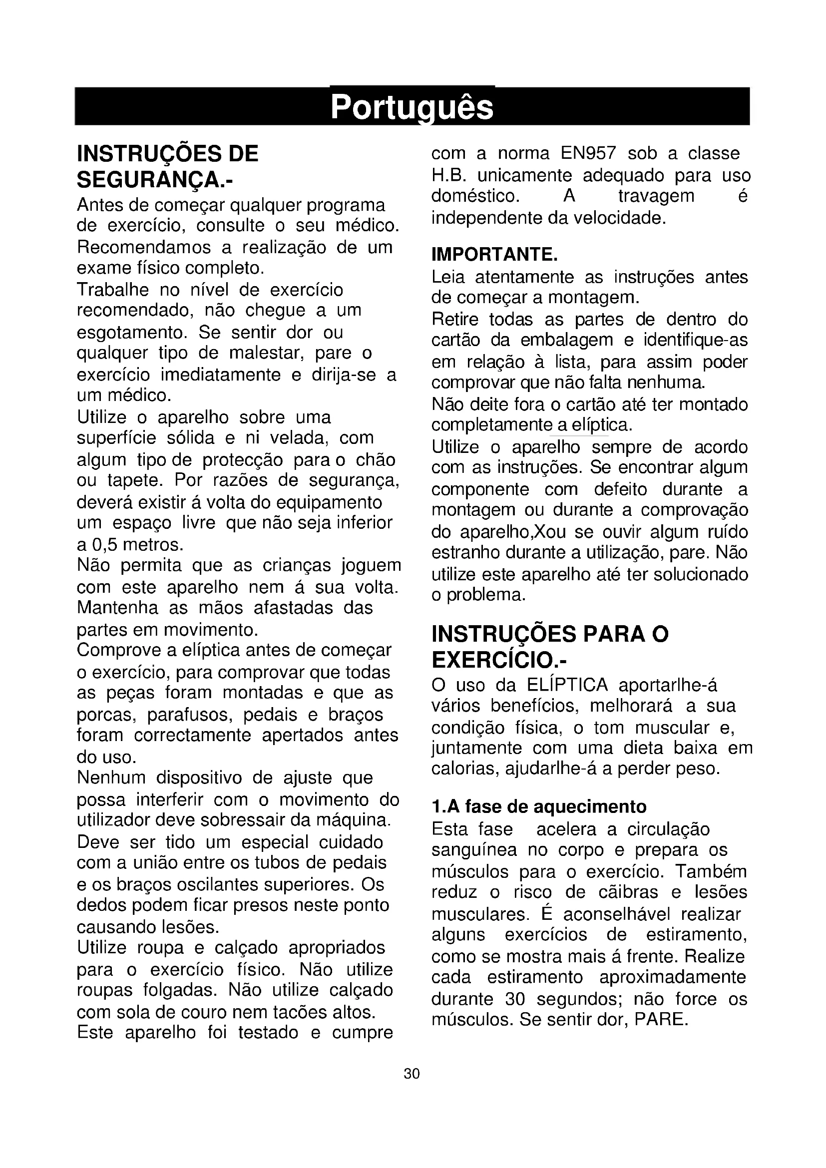 SEGURANÇA.- Antes de começar qualquer programa de exercício, consulte o seu médico. Recomendamos a realização de um exame físico completo. Trabalhe no nível de exercício recomendado, não chegue a um esgotamento. Se sentir dor ou qualquer tipo de malestar, pare o exercício imediatamente e dirija-se a um médico. Utilize o aparelho sobre uma superfície sólida e ni velada, com algum tipo de protecção para o chão ou tapete. Por razões de segurança, deverá existir á volta do equipamento um espaço livre que não seja inferior a 0,5 metros. Não permita que as crianças joguem com este aparelho nem á sua volta. Mantenha as mãos afastadas das partes em movimento. Comprove a elíptica antes de começar o exercício, para comprovar que todas as peças foram montadas e que as porcas, parafusos, pedais e braços foram correctamente apertados antes do uso. Nenhum dispositivo de ajuste que possa interferir com o movimento do utilizador deve sobressair da máquina. Deve ser tido um especial cuidado com a união entre os tubos de pedais e os braços oscilantes superiores. Os dedos podem ficar presos neste ponto causando lesões. Utilize roupa e calçado apropriados para o exercício físico. Não utilize roupas folgadas. Não utilize calçado com sola de couro nem tacões altos. Este aparelho foi testado e cumpre com a norma EN957 sob a classe H.B. unicamente adequado para uso doméstico. A travagem é independente da velocidade. IMPORTANTE. Leia atentamente as instruções antes de começar a montagem. Retire todas as partes de dentro do cartão da embalagem e identifique-as em relação à lista, para assim poder comprovar que não falta nenhuma. Não deite fora o cartão até ter montado completamente a elíptica. Utilize o aparelho sempre de acordo com as instruções. Se encontrar algum componente com defeito durante a montagem ou durante a comprovação do aparelho,Xou se ouvir algum ruído estranho durante a utilização, pare. Não utilize este aparelho até ter solucionado o problema.