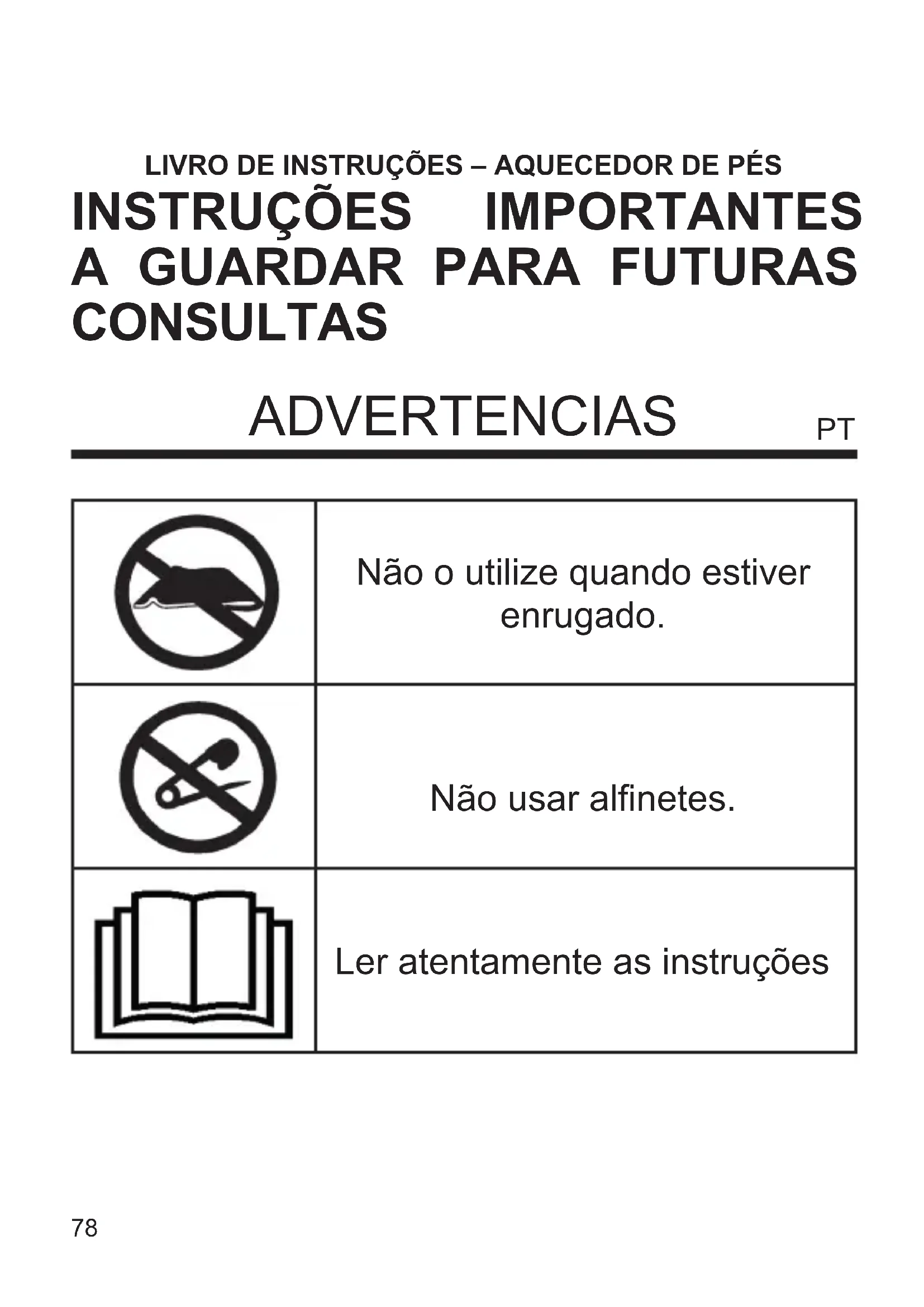 CONSULTAS Não o utilize quando estiver enrugado. Não usar alnetes. Ler atentamente as instruções ADVERTENCIAS PT79 Este dispositivo não deve ser usado por pessoas insensíveis ao calor ou por pessoas muito vulneráveis, incapazes de reagir ao superaquecimento. Este dispositivo pode ser usado por crianças com 8 anos de idade ou mais e por pessoas com habilidades físicas, sensoriais ou mentais diminuídas ou falta de experiência ou conhecimento, desde que a vigilância adequada tenha sido garantida ou que tenham recebido instruções sobre o uso seguro do dispositivo. e ter entendido os perigos correspondentes. As crianças não devem brincar com o dispositivo. As operações de limpeza e manutenção não devem ser realizadas por crianças, a menos que tenham mais de 8 anos e sejam supervisionadas. Não use se estiver molhado ou molhado. A aplicação prolongada com alta regulação pode causar queimaduras na pele. Para uso contínuo ou prolongado do dispositivo, por exemplo, por um usuário que possa adormecer, coloque o dispositivo de controle na posição 1 para evitar queimaduras na pele. De qualquer forma, evite adormecer enquanto o dispositivo estiver em execução. Quando o aparelho não for utilizado, mantenha-o na embalagem original em local seco e limpo.80 Não sobreponha pesos. Não dobre ou deforme o dispositivo colocando objetos nele quando armazenados. Este dispositivo não requer nenhuma manutenção especíca, é suciente examinar o dispositivo, seu c abo exível e a u n i d ad e de c o nt ro le f re qu en t em ent e para determinar quaisquer sinais de desgaste ou deterioração. Se tais sinais estiverem presentes ou se o dispositivo tiver sido mal utilizado, leve-o ao centro de ajuda para vericação antes de reutilizar. Se o cabo de alimentação estiver quebrado, ele deverá ser substituído exclusivamente pelos centros de serviço autorizados pelo fabricante para evitar riscos. Para limpar o dispositivo, consulte o parágrafo MANUTENÇÃO. Em caso de gravidez, diabetes, marcapasso ou doença, consulte um médico antes de usar. O dispositivo foi projetado e fabricado para funcionar como uma almofada de aquecimento; Qualquer outro uso é considerado impróprio e, portanto, perigoso. NÃO USE SEM TAMPA DE PROTEÇÃO. Não use para aquecer animais. Não use o aquecedor de pés com sapatos. Este dispositivo não se destina a ser usado em hospitais.81 Guarde a garantia, o recibo e este folheto de instruções para consultas subseqüentes. Depois de remover a embalagem, verique a integridade do dispositivo e, em caso de danos visíveis, não o utilize e entre em contato com o revendedor. Não deixe partes da embalagem ao alcance de crianças. O aparelho não deve ser usado como brinquedo; É um dispositivo elétrico e, portanto, deve ser considerado. Antes de conectar o aparelho, verique se a tensão presente na tomada corresponde à indicada nas características nominais. Se o soquete e o plugue não forem compatíveis, substitua o soquete por pessoal qualicado por um do tipo apropriado. Não use adaptadores ou extensões que não correspondam às normas de segurança atuais ou excedam os limites de carga atuais. Desconecte o aparelho da fonte de alimentação quando não estiver em uso. Não puxe o cabo de alimentação ou o próprio dispositivo para desconectar o plugue da tomada. O uso de qualquer dispositivo elétrico requer o respeito de alguns regras fundamentais, em particular: - Não toque no dispositivo com as mãos molhadas ou úmidas. - Não deixe o dispositivo exposto à ação de agentes atmosféricos (chuva, sol). - Não submeta a choques. É aconselhável desenrolar completamente o cabo de alimentação ao longo de todo o seu comprimento, evitando superaquecimento. Em caso de avaria, intervenção do fusível ou do fusível de proteção ou operação anormal do aparelho, desconecte o plugue imediatamente, não realize nenhuma intervenção e entre em contato com um centro de asistencia autorizado. Por razões de segurança, não abra o dispositivo ou a unidade de controle, não Existem peças de serviço dentro. Não aproxime a unidade de controle de fontes de calor. Não cubra a unidade de controle nem a coloque no dispositivo enquanto estiver em operação. O dispositivo não deve estar sujeito ao peso corporal. Não use o dispositivo ao ar livre. Não use o aparelho junto com outros dispositivos de aquecimento. Quando o dispositivo estiver armazenado, deixe-o Deixe esfriar antes de dobrar.82 Instruções de uso Insira a cha na tomada. Ligue o aparelho mantendo pressionado o botão ON-OFF por alguns segundos. O dispositivo liga automaticamente na posição 3. Para alterar a posição de aquecimento, pressione a tecla TEMP repetidamente até que o nível desejado possa ser ajustado de 1 a 6. Antes de usar, pré-aqueça o dispositivo na posição 6 pelos primeiros 10 minutos e depois dena a posição desejada. Em caso de uso prolongado ou contínuo, opere-o no posição 1 para evitar queimaduras na pele. Após 90 minutos de operação, o dispositivo desliga automático. Se o símbolo P ou E aparecer na tela, isso indica que o dispositivo está quebrado. Para desligar o aparelho, pressione o botão ON / OFF por 3 segundos. Manutenção Antes de limpar o aparelho, desconecte-o da tomada e deixe esfriar completamente. Para limpar o aparelho, use um pano macio e levemente úmido. Não use substâncias, líquidos ou panos excessivamente úmidos, pois possíveis inltrações podem danicar irreparavelmente o dispositivo. Não limpe a seco nem use solventes químicos, pois eles podem danicar o dispositivo e comprometer a segurança. NÃO MERGULHE O APARELHO NA ÁGUA. Não substitua ou use o aparelho antes que esteja completamente seco.83