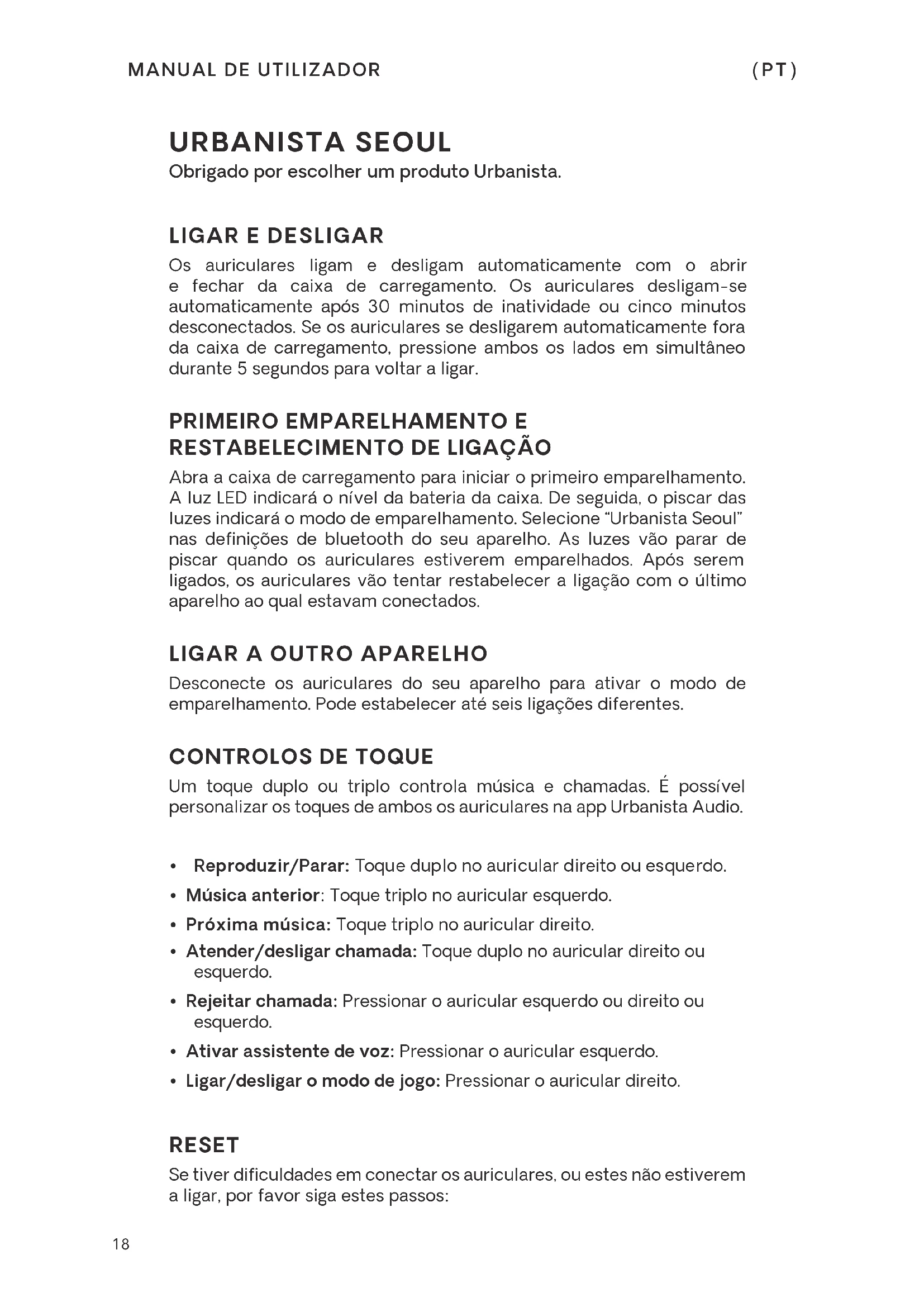 Abra a caixa de carregamento para iniciar o primeiro emparelhamento. A luz LED indicará o nível da bateria da caixa. De seguida, o piscar das luzes indicará o modo de emparelhamento. Selecione “Urbanista Seoul” nas definições de bluetooth do seu aparelho. As luzes vão parar de piscar quando os auriculares estiverem emparelhados. Após serem ligados, os auriculares vão tentar restabelecer a ligação com o último aparelho ao qual estavam conectados.