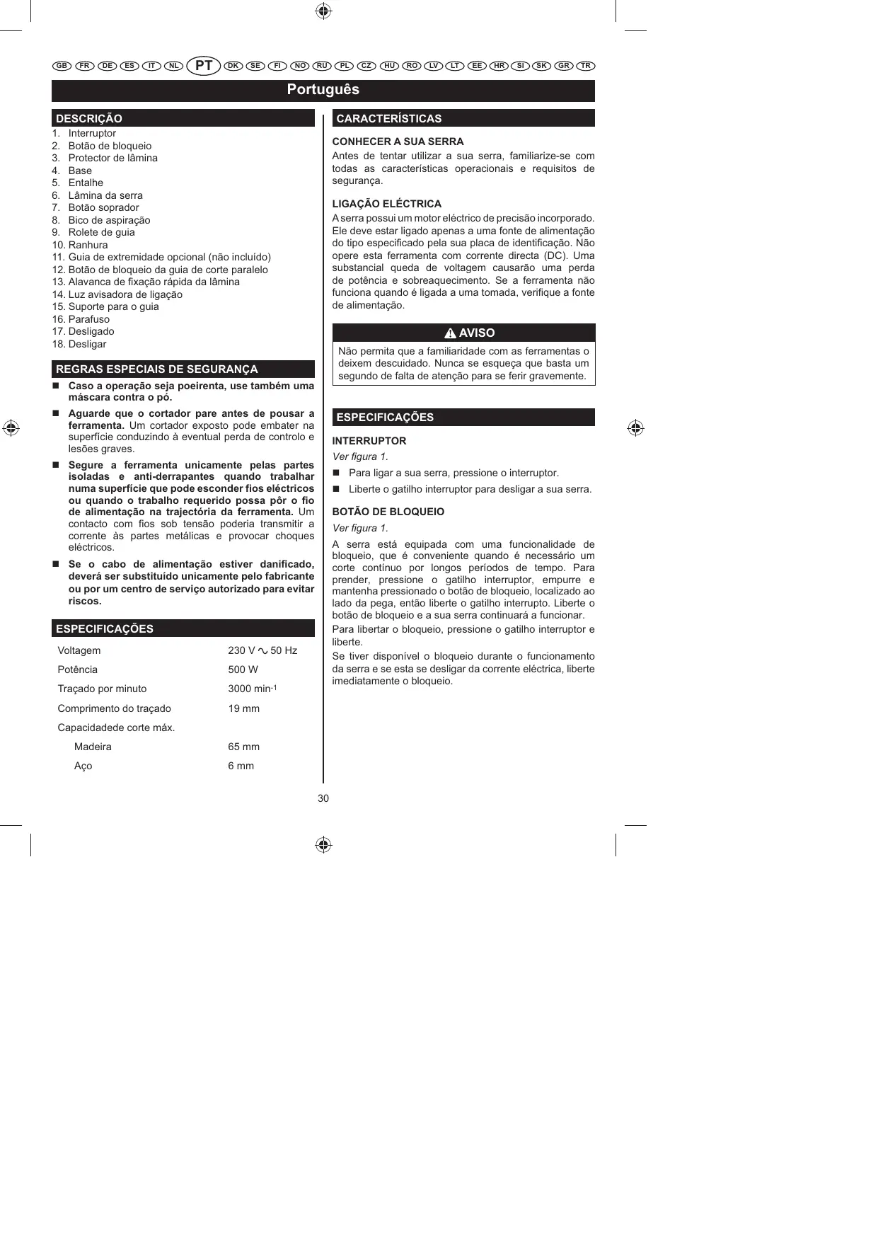 Ver gura 1. A serra está equipada com uma funcionalidade de bloqueio, que é conveniente quando é necessário um corte contínuo por longos períodos de tempo. Para prender, pressione o gatilho interruptor, empurre e mantenha pressionado o botão de bloqueio, localizado ao lado da pega, então liberte o gatilho interrupto. Liberte o botão de bloqueio e a sua serra continuará a funcionar. Para libertar o bloqueio, pressione o gatilho interruptor e liberte. Se tiver disponível o bloqueio durante o funcionamento da serra e se esta se desligar da corrente eléctrica, liberte imediatamente o bloqueio. Se o cabo de alimentação estiver danificado, deverá ser substituído unicamente pelo fabricante ou por um centro de serviço autorizado para evitar riscos. ESPECIFICAÇÕES Voltagem 230 V 50 Hz Potência 500 W Traçado por minuto 3000 min-1 Comprimento do traçado 19 mm Capacidadede corte máx. Madeira 65 mm Aço 6 mm