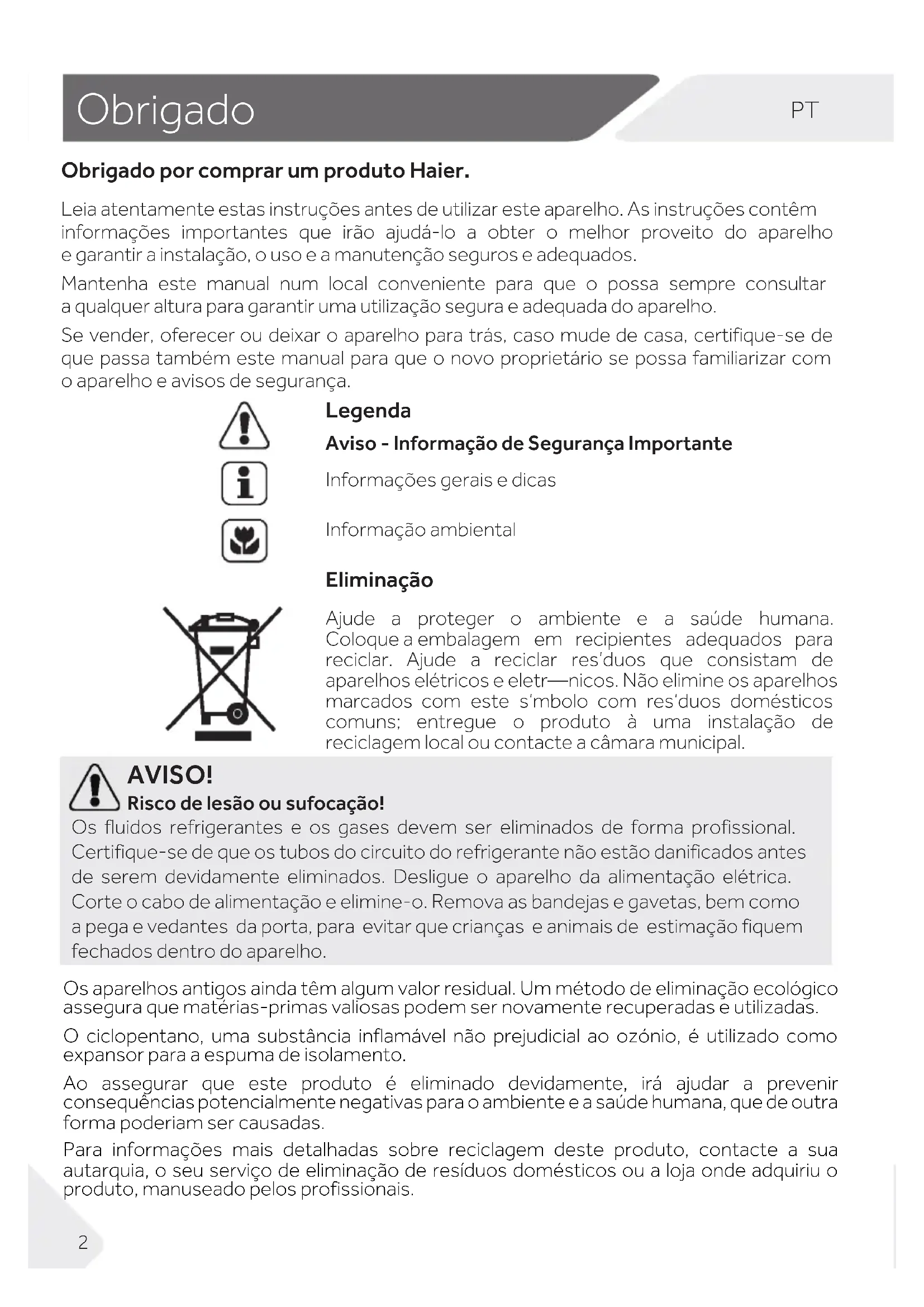 Obrigado Obrigado por comprar um produto Haier. Leia atentamente estas instruções antes de utilizar este aparelho. As instruções contêm informações importantes que irão ajudá-lo a obter o melhor proveito do aparelho e garantir a instalação, o uso e a manutenção seguros e adequados. Mantenha este manual num local conveniente para que o possa sempre consultar a qualquer altura para garantir uma utilização segura e adequada do aparelho. Se vender, oferecer ou deixar o aparelho para trás, caso mude de casa, certifique-se de que passa também este manual para que o novo proprietário se possa familiarizar com o aparelho e avisos de segurança. Legenda Aviso - Informação de Segurança Importante Informações gerais e dicas Informação ambiental Eliminação Ajude a proteger o ambiente e a saúde humana. Coloque a embalagem em recipientes adequados para reciclar. Ajude a reciclar resíduos que consistam de aparelhos elétricos e eletrónicos. Não elimine os aparelhos marcados com este símbolo com resíduos domésticos comuns; entregue o produto à uma instalação de reciclagem local ou contacte a câmara municipal. AVISO! Risco de lesão ou sufocação! Os fluidos refrigerantes e os gases devem ser eliminados de forma profissional. Certifique-se de que os tubos do circuito do refrigerante não estão danificados antes de serem devidamente eliminados. Desligue o aparelho da alimentação elétrica. Corte o cabo de alimentação e elimine-o. Remova as bandejas e gavetas, bem como a pega e vedantes da porta, para evitar que crianças e animais de estimação fiquem fechados dentro do aparelho.Os aparelhos antigos ainda têm algum valor residual. Um método de eliminação ecológico assegura que matérias-primas valiosas podem ser novamente recuperadas e utilizadas. O ciclopentano, uma substância inflamável não prejudicial ao ozónio, é utilizado como expansor para a espuma de isolamento. Ao assegurar que este produto é eliminado devidamente, irá ajudar a prevenir consequências potencialmentenegativas para o ambiente e a saúde humana,que de outra forma poderiam ser causadas. Para informações mais detalhadas sobre reciclagem deste produto, contacte a sua autarquia, o seu serviço de eliminação de resíduos domésticos ou a loja onde adquiriu o produto, manuseado pelos profissionais. Acessórios Verifique os acessórios e a literatura de acordo com esta lista: 3 espaçadores 1 etiqueta energética 1 cartão de garantia 1 cartão de garantia alargada 1 Manual do Utilizador 1 Autocolante "OK" do Manual do Utilizador 2 bandejas para ovos 2 bandejas para cubos de gelo