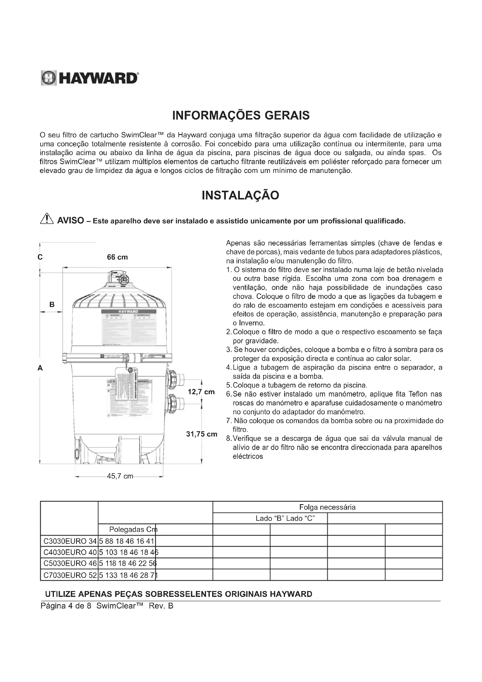 AVISO – Ensaios de pressão do sistema da bomba e do filtro acima de 3,5 Bar (50 PSI) podem provocar a separação explosiva dos componentes. A separação de componentes pode provocar a morte ou ferimentos graves.UTILIZE APENAS PEÇAS SOBRESSELENTES ORIGINAIS HAYWARD Página 3 de 8 SwimClear™ Rev. B Muito obrigado por escolher a Hayward. Este manual contém informações importantes sobre o funcionamento e a manutenção do seu produto. Conserve-o para referência futura. PARA REGISTAR O SEU PRODUTO NA NOSSA BASE DE DADOS, DIRIJA-SE A: www.hayward.fr/en/services/register-your-product