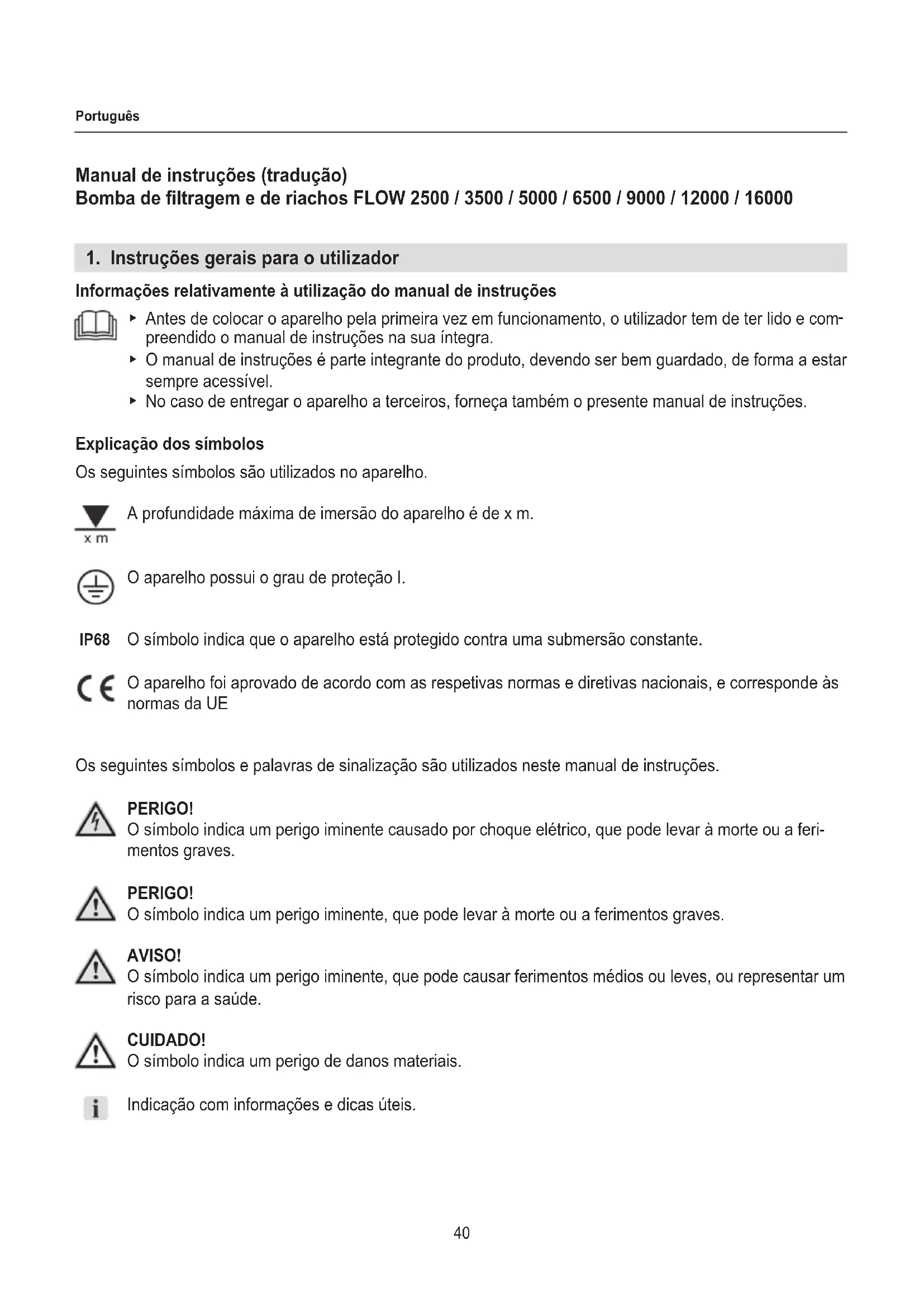 preendido o manual de instruções na sua íntegra. ▶ O manual de instruções é parte integrante do produto, devendo ser bem guardado, de forma a estar sempre acessível. ▶ No caso de entregar o aparelho a terceiros, forneça também o presente manual de instruções. Explicação dos símbolos Os seguintes símbolos são utilizados no aparelho. A profundidade máxima de imersão do aparelho é de x m. O aparelho possui o grau de proteção I. O símbolo indica que o aparelho está protegido contra uma submersão constante. O aparelho foi aprovado de acordo com as respetivas normas e diretivas nacionais, e corresponde às normas da UE Os seguintes símbolos e palavras de sinalização são utilizados neste manual de instruções. PERIGO! O símbolo indica um perigo iminente causado por choque elétrico, que pode levar à morte ou a feri