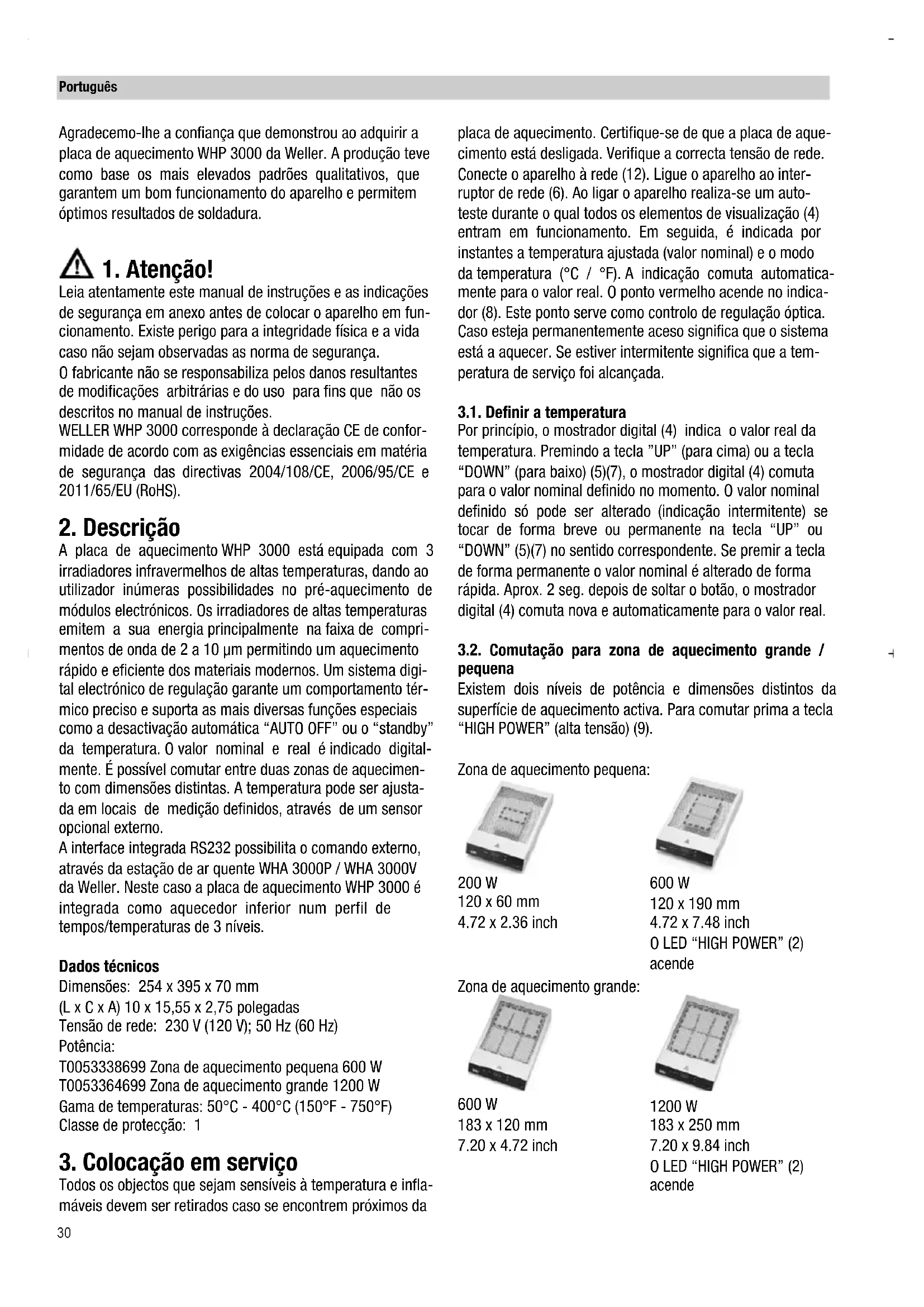 Leia atentamente este manual de instruções e as indicações de segurança em anexo antes de colocar o aparelho em fun- cionamento. Existe perigo para a integridade física e a vida caso não sejam observadas as norma de segurança. O fabricante não se responsabiliza pelos danos resultantes de modificações arbitrárias e do uso para fins que não os descritos no manual de instruções. WELLER WHP 3000 corresponde à declaração CE de confor- midade de acordo com as exigências essenciais em matéria de segurança das directivas 2004/108/CE, 2006/95/CE e 2011/65/EU (RoHS).