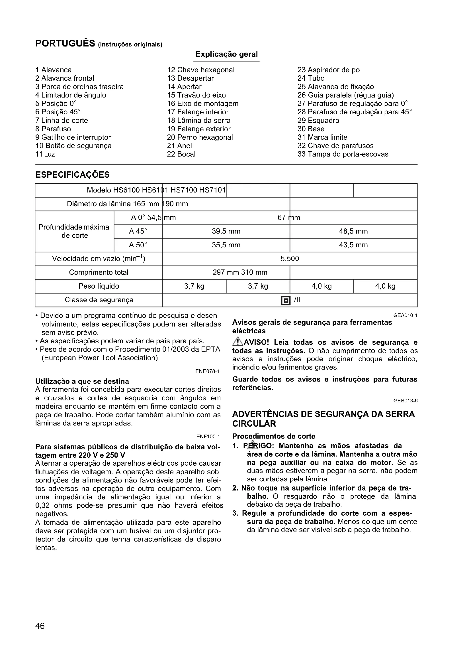 - Peso de acordo com o Procedimento 01/2003 da EPTA (European Power Tool Association) ENE078-1 Utilização a que se destina A ferramenta foi concebida para executar cortes direitos e cruzados e cortes de esquadria com ângulos em madeira enquanto se mantém em firme contacto com a peça de trabalho. Pode cortar também alumínio com as lâminas da serra apropriadas. ENF100-1 Para sistemas públicos de distribuição de baixa vol- tagem entre 220 V e 250 V Alternar a operação de aparelhos eléctricos pode causar flutuações de voltagem. A operação deste aparelho sob condições de alimentação não favoráveis pode ter efei- tos adversos na operação de outro equipamento. Com uma impedância de alimentação igual ou inferior a 0,32 ohms pode-se presumir que não haverá efeitos negativos. A tomada de alimentação utilizada para este aparelho deve ser protegida com um fusível ou um disjuntor pro- tector de circuito que tenha características de disparo lentas. GEA010-1 Avisos gerais de segurança para ferramentas eléctricas AVISO! Leia todas os avisos de segurança e todas as instruções. O não cumprimento de todos os avisos e instruções pode originar choque eléctrico, incêndio e/ou ferimentos graves. Guarde todos os avisos e instruções para futuras referências. GEB013-6 ADVERTÊNCIAS DE SEGURANÇA DA SERRA CIRCULAR Procedimentos de corte