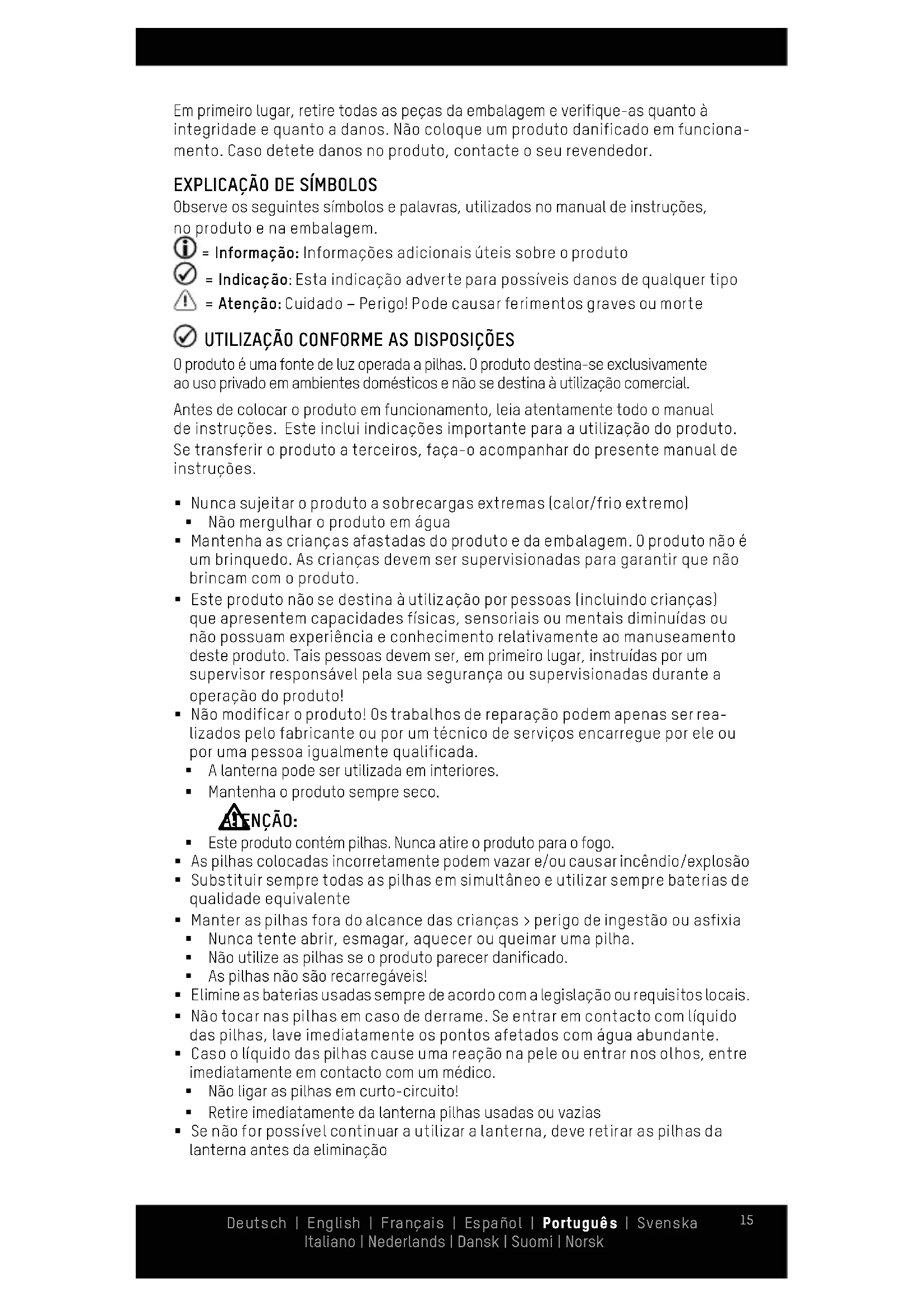 ATENÇÃO: § Este produto contém pilhas. Nunca atire o produto para o fogo. § As pilhas colocadas incorretamente podem vazar e/ou causar incêndio/explosão § Substituir sempre todas as pilhas em simultâneo e utilizar sempre baterias de qualidade equivalente § Manter as pilhas fora do alcance das crianças > perigo de ingestão ou asfixia § Nunca tente abrir, esmagar, aquecer ou queimar uma pilha. § Não utilize as pilhas se o produto parecer danificado. § As pilhas não são recarregáveis! § Elimine as baterias usadas sempre de acordo com a legislação ou requisitos locais. § Não tocar nas pilhas em caso de derrame. Se entrar em contacto com líquido das pilhas, lave imediatamente os pontos afetados com água abundante. § Caso o líquido das pilhas cause uma reação na pele ou entrar nos olhos, entre imediatamente em contacto com um médico. § Não ligar as pilhas em curto-circuito! § Retire imediatamente da lanterna pilhas usadas ou vazias § Se não for possível continuar a utilizar a lanterna, deve retirar as pilhas da lanterna antes da eliminação Deutsch | English | Français | Español | Português | Svenska Italiano | Nederlands | Dansk | Suomi | Norsk16