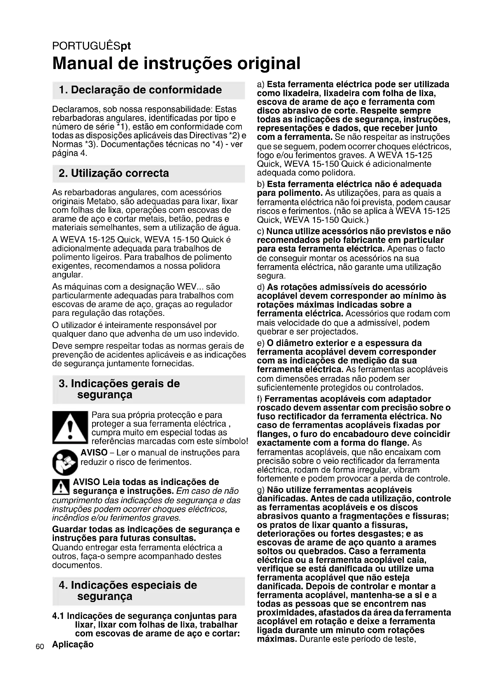 Manual de instruções original Declaramos, sob nossa responsabilidade: Estas rebarbadoras angulares, identificadas por tipo e número de série *1), estão em conformidade com todas as disposições aplicáveis das Directivas *2) e Normas *3). Documentações técnicas no *4) - ver página 4. As rebarbadoras angulares, com acessórios originais Metabo, são adequadas para lixar, lixar com folhas de lixa, operações com escovas de arame de aço e cortar metais, betão, pedras e materiais semelhantes, sem a utilização de água. A WEVA 15-125 Quick, WEVA 15-150 Quick é adicionalmente adequada para trabalhos de polimento ligeiros. Para trabalhos de polimento exigentes, recomendamos a nossa polidora angular. As máquinas com a designação WEV... são particularmente adequadas para trabalhos com escovas de arame de aço, graças ao regulador para regulação das rotações. O utilizador é inteiramente responsável por qualquer dano que advenha de um uso indevido. Deve sempre respeitar todas as normas gerais de prevenção de acidentes aplicáveis e as indicações de segurança juntamente fornecidas. Para sua própria protecção e para proteger a sua ferramenta eléctrica , cumpra muito em especial todas as referências marcadas com este símbolo! AVISO – Ler o manual de instruções para reduzir o risco de ferimentos. AVISO Leia todas as indicações de segurança e instruções. Em caso de não cumprimento das indicações de segurança e das instruções podem ocorrer choques eléctricos, incêndios e/ou ferimentos graves. Guardar todas as indicações de segurança e instruções para futuras consultas. Quando entregar esta ferramenta eléctrica a outros, faça-o sempre acompanhado destes documentos.