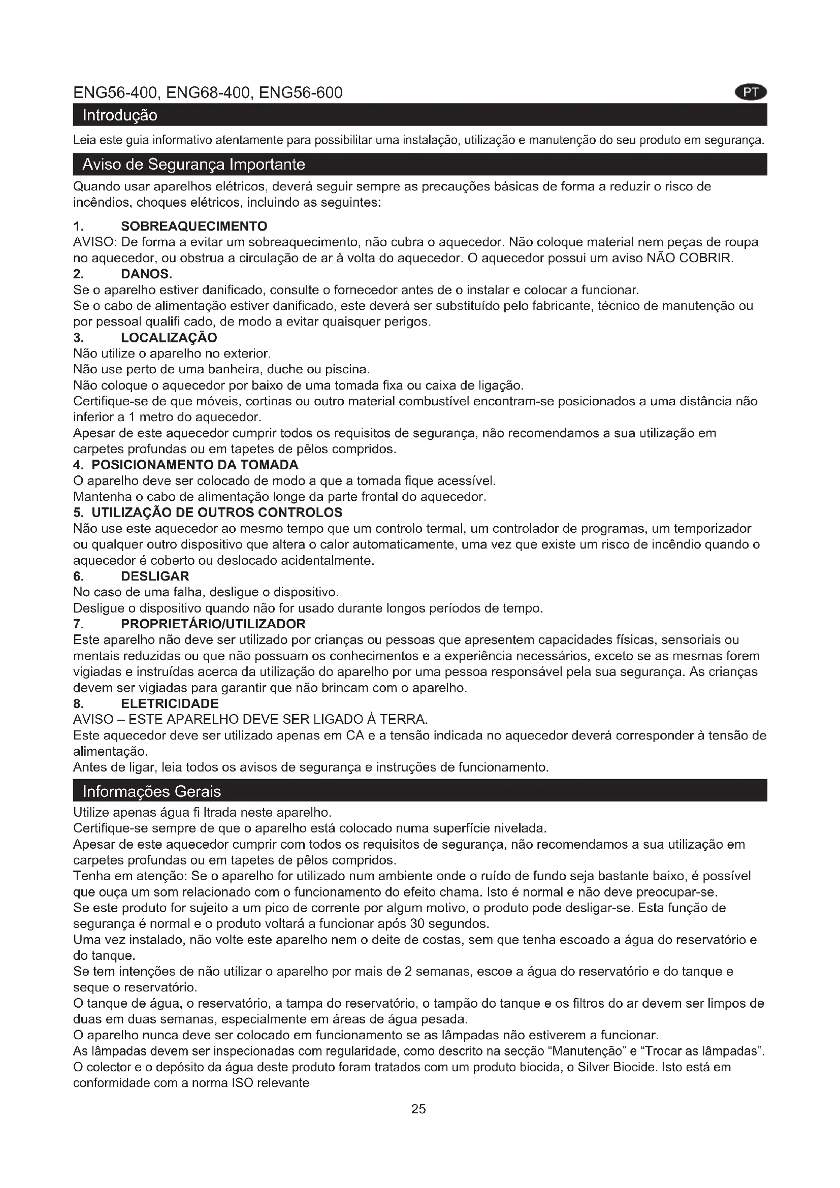 AVISO – ESTE APARELHO DEVE SER LIGADO À TERRA. Este aquecedor deve ser utilizado apenas em CA e a tensão indicada no aquecedor deverá corresponder à tensão de alimentação. Antes de ligar, leia todos os avisos de segurança e instruções de funcionamento. Informações Gerais Utilize apenas água fi ltrada neste aparelho. Certifi que-se sempre de que o aparelho está colocado numa superfície nivelada. Apesar de este aquecedor cumprir com todos os requisitos de segurança, não recomendamos a sua utilização em carpetes profundas ou em tapetes de pêlos compridos. Tenha em atenção: Se o aparelho for utilizado num ambiente onde o ruído de fundo seja bastante baixo, é possível que ouça um som relacionado com o funcionamento do efeito chama. Isto é normal e não deve preocupar-se. Se este produto for sujeito a um pico de corrente por algum motivo, o produto pode desligar-se. Esta função de segurança é normal e o produto voltará a funcionar após 30 segundos. Uma vez instalado, não volte este aparelho nem o deite de costas, sem que tenha escoado a água do reservatório e do tanque. Se tem intenções de não utilizar o aparelho por mais de 2 semanas, escoe a água do reservatório e do tanque e seque o reservatório. O tanque de água, o reservatório, a tampa do reservatório, o tampão do tanque e os fi ltros do ar devem ser limpos de duas em duas semanas, especialmente em áreas de água pesada. O aparelho nunca deve ser colocado em funcionamento se as lâmpadas não estiverem a funcionar. As lâmpadas devem ser inspecionadas com regularidade, como descrito na secção “Manutenção” e “Trocar as lâmpadas”. O colector e o depósito da água deste produto foram tratados com um produto biocida, o Silver Biocide. Isto está em conformidade com a norma ISO relevante26 Instruções de instalação Esta secção descreve a forma de confi gurar a salamandra.