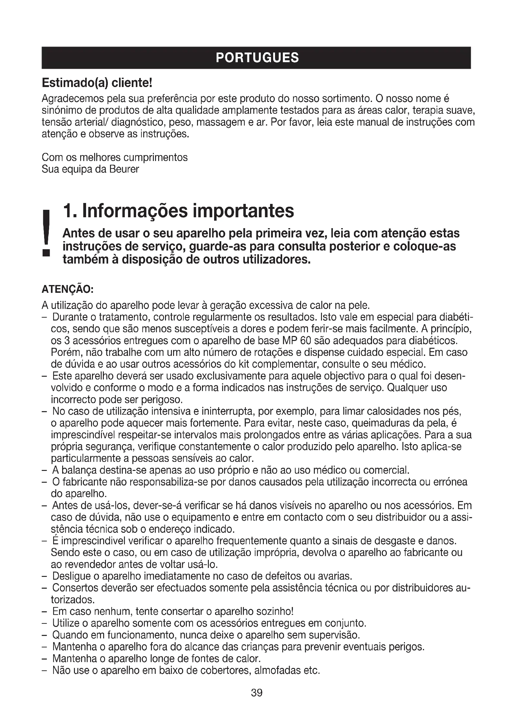Verwijder het toestel conform het Besluit Afval van Elektrische en Elektronische Apparaten 2002/96/EC – WEEE (Waste Electrical and Electronic Equipment). Voor nadere informatie kunt u zich richten tot de bevoegde instanties voor afvalverwijdering.39 Estimado(a) cliente! Agradecemos pela sua preferência por este produto do nosso sortimento. O nosso nome é sinónimo de produtos de alta qualidade amplamente testados para as áreas calor, terapia suave, tensão arterial/ diagnóstico, peso, massagem e ar. Por favor, leia este manual de instruções com atenção e observe as instruções. Com os melhores cumprimentos Sua equipa da Beurer