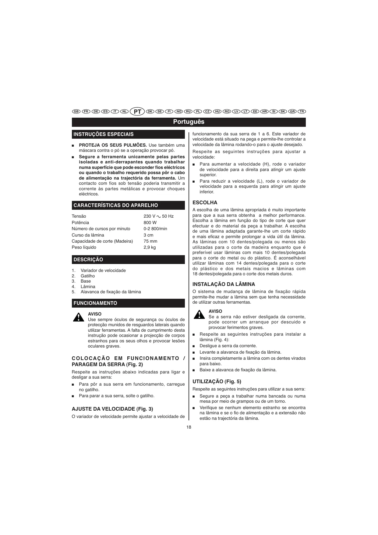 Tensão Potência Número de cursos por minuto Curso da lâmina Capacidade de corte (Madeira) Peso líquido A escolha de uma lâmina apropriada é muito importante para que a sua serra obtenha a melhor performance. Escolha a lâmina em função do tipo de corte que quer efectuar e do material da peça a trabalhar. A escolha de uma lâmina adaptada garante-lhe um corte rápido e mais eficaz e permite prolongar a vida útil da lâmina. As lâminas com 10 dentes/polegada ou menos são utilizadas para o corte da madeira enquanto que é preferível usar lâminas com mais 10 dentes/polegada para o corte do metal ou do plástico. É aconselhável utilizar lâminas com 14 dentes/polegada para o corte do plástico e dos metais macios e lâminas com 18 dentes/polegada para o corte dos metais duros. 230 V 50 Hz 800 W 0-2 800/min 3 cm 75 mm 2,9 kg DESCRIÇÃO