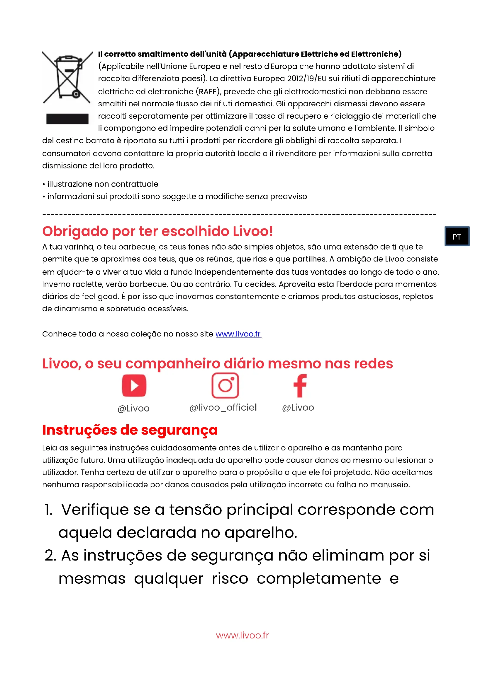 Obrigado por ter escolhido Livoo! A tua varinha, o teu barbecue, os teus fones não são simples objetos, são uma extensão de ti que te permite que te aproximes dos teus, que os reúnas, que rias e que partilhes. A ambição de Livoo consiste em ajudar-te a viver a tua vida a fundo independentemente das tuas vontades ao longo de todo o ano. Inverno raclette, verão barbecue. Ou ao contrário. Tu decides. Aproveita esta liberdade para momentos diários de feel good. É por isso que inovamos constantemente e criamos produtos astuciosos, repletos de dinamismo e sobretudo acessíveis. Conhece toda a nossa coleção no nosso site www.livoo.fr Livoo, o seu companheiro diário mesmo nas redes