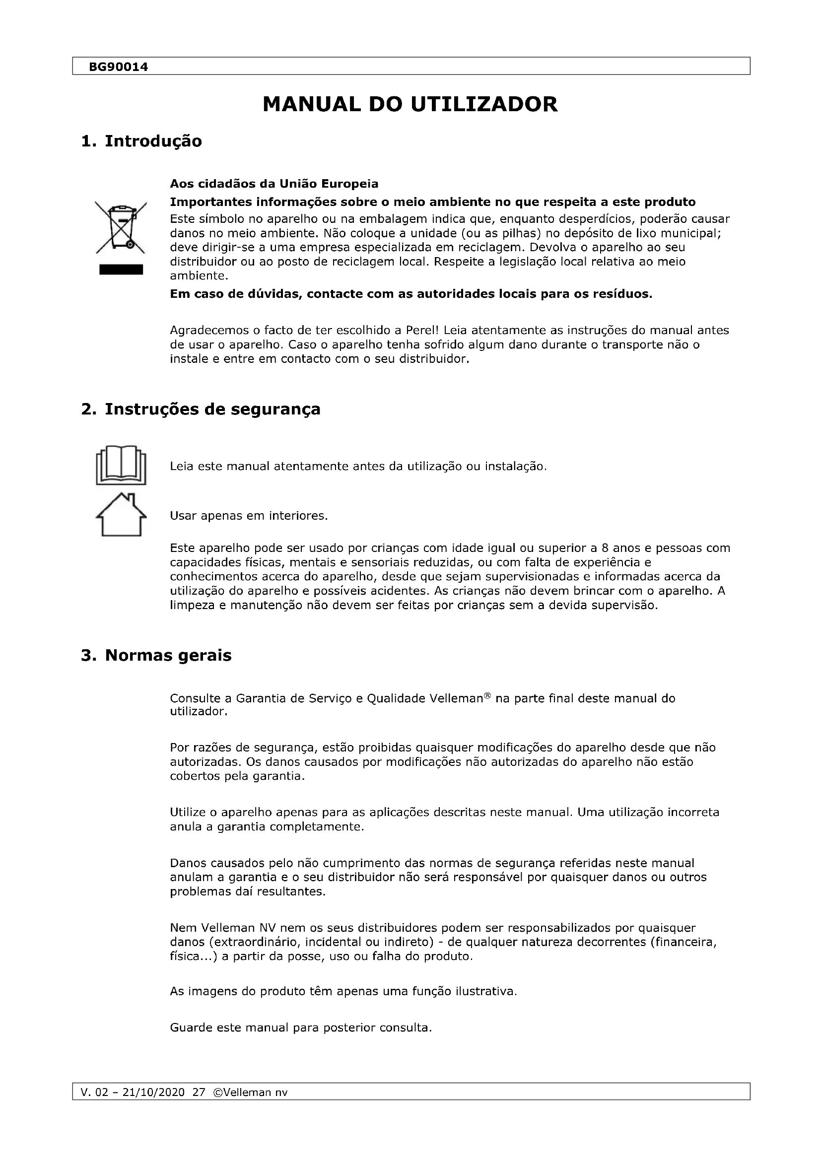 Utilize este aparelho apenas com acessórios originais. A Velleman NV não será responsável por quaisquer danos ou lesões causados pelo uso (indevido) do aparelho. Para mais informação sobre este produto e para aceder à versão mais recente deste manual do utilizador, visite a nossa página www.velleman.eu. Podem alterar-se as especificações e o conteúdo deste manual sem aviso prévio.