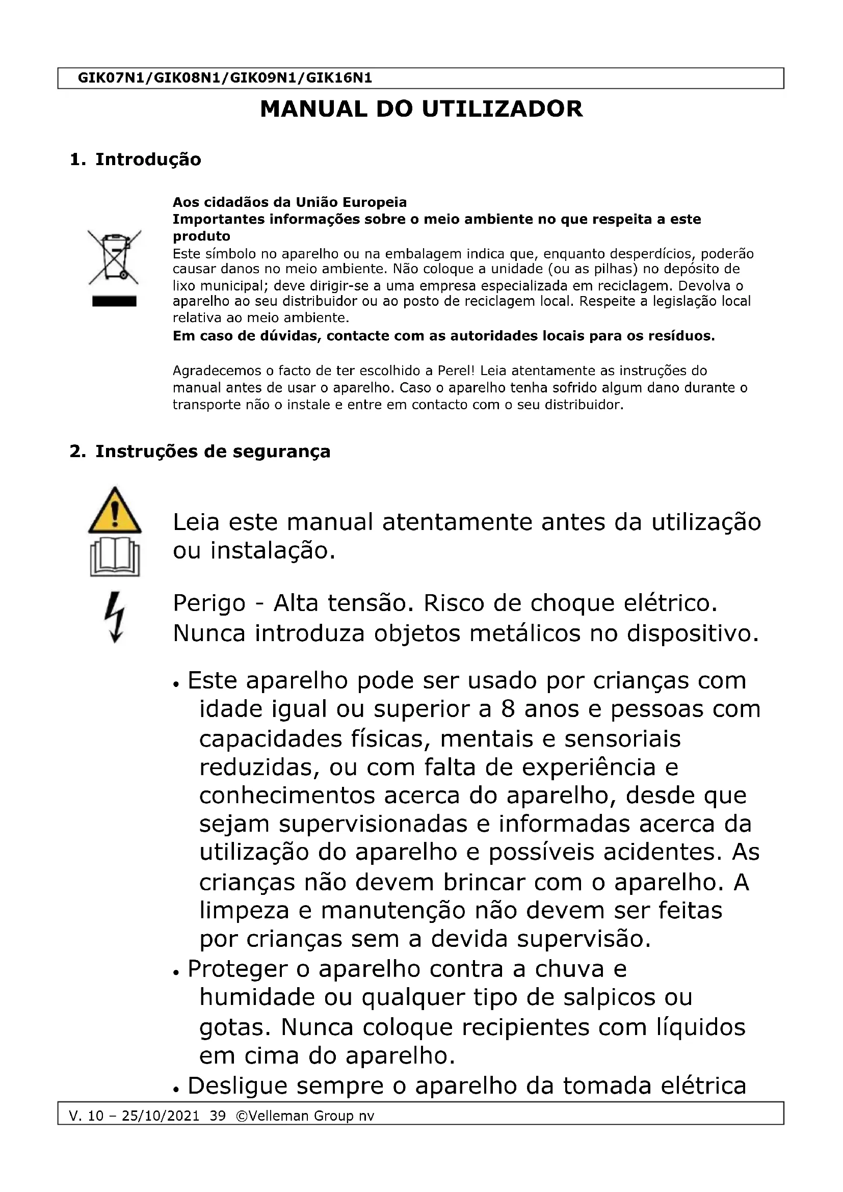 Utilize este aparelho apenas com acessórios originais. A Velleman Group nv não será responsável por quaisquer danos ou lesões causados pelo uso (indevido) do aparelho. Para mais informação sobre este produto e para aceder à versão mais recente deste manual do utilizador, visite a nossa página www.velleman.eu. Podem alterar-se as especificações e o conteúdo deste manual sem aviso prévio.