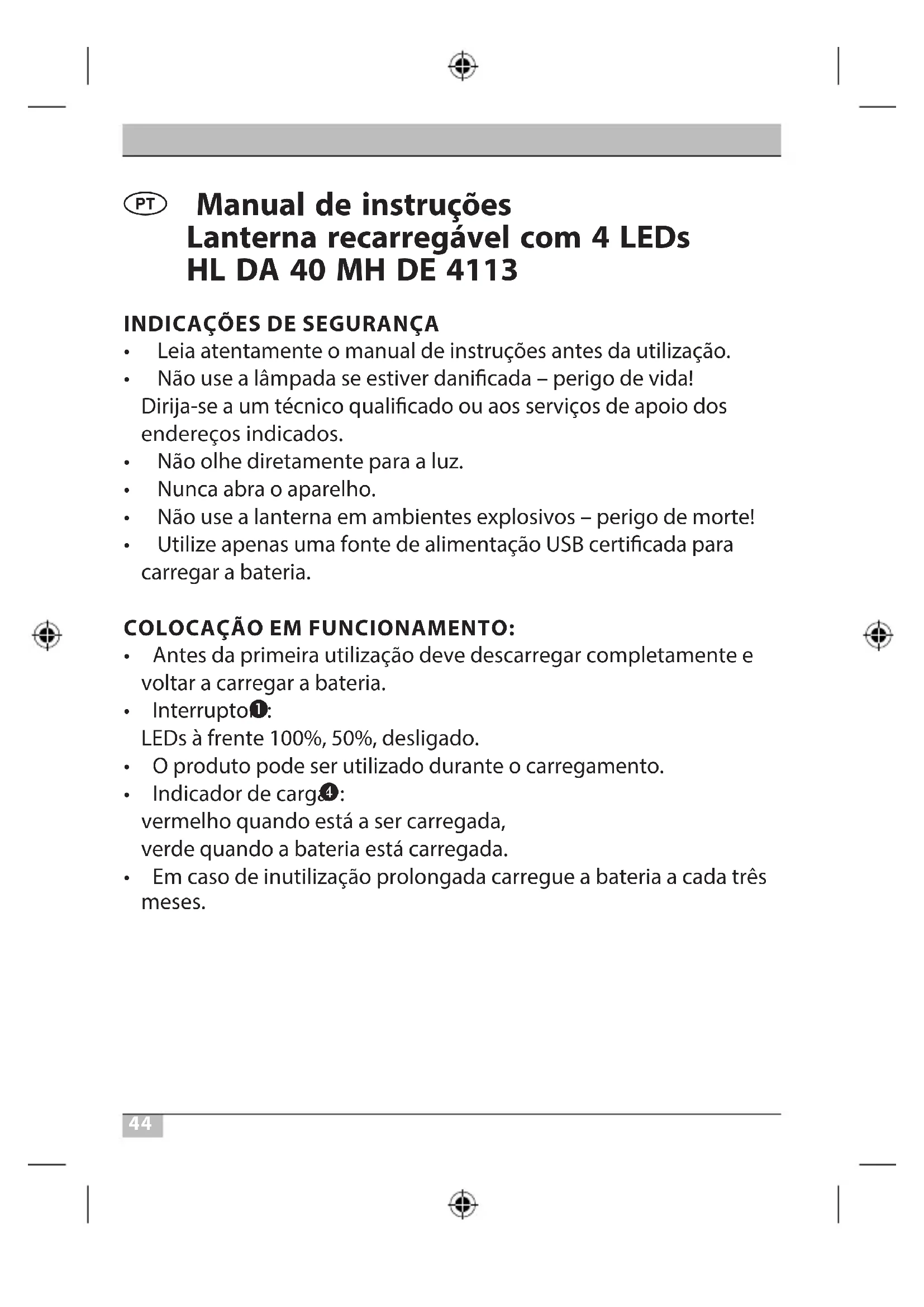 Manual de instruções Lanterna recarregável com 4 LEDs HL DA 40 MH DE 4113
