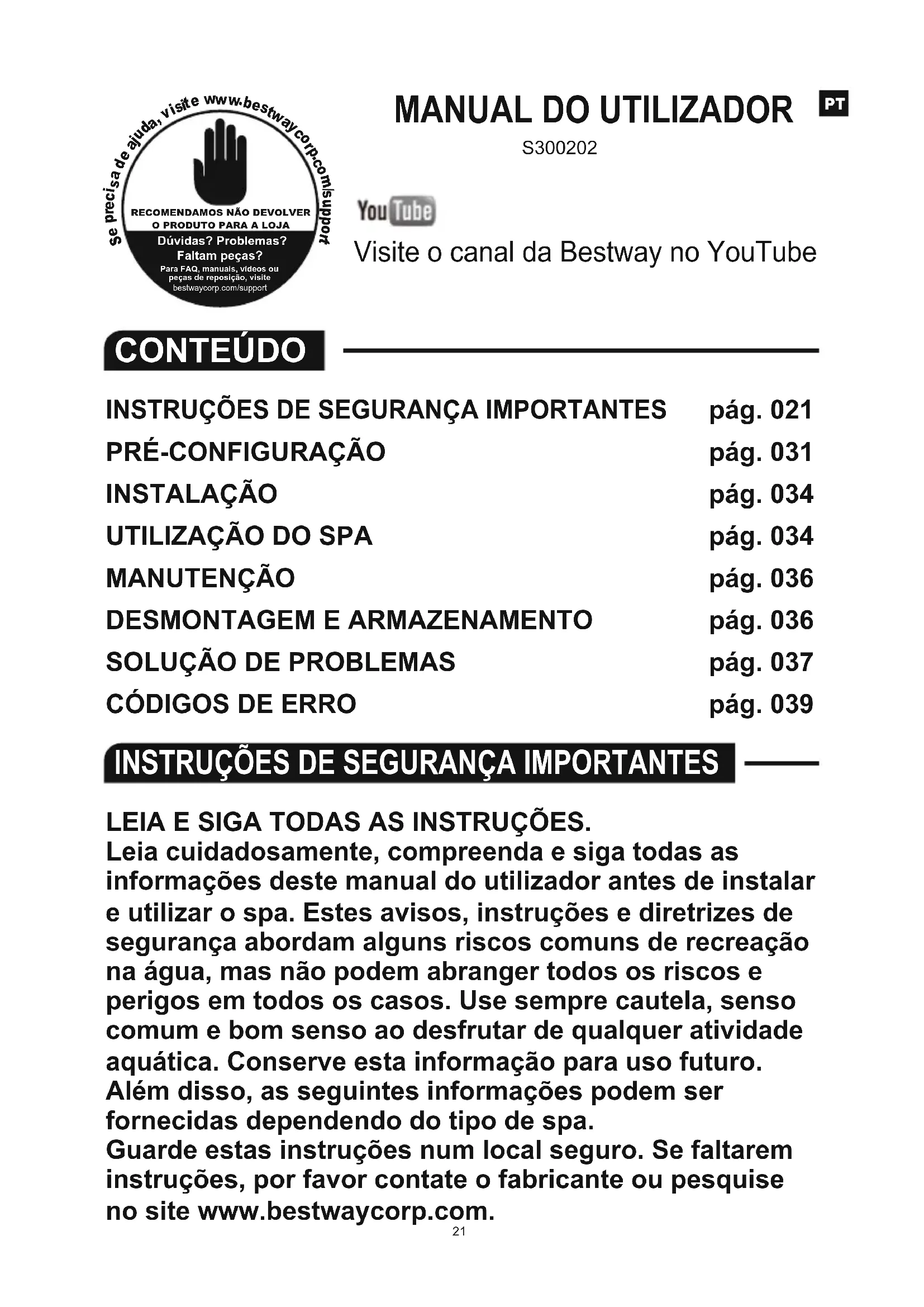 www.bestwaycorp.com. Detected electric from ground wire.INSTRUÇÕES DE SEGURANÇA IMPORTANTES LEIA E SIGA TODAS AS INSTRUÇÕES. Leia cuidadosamente, compreenda e siga todas as informações deste manual do utilizador antes de instalar e utilizar o spa. Estes avisos, instruções e diretrizes de segurança abordam alguns riscos comuns de recreação na água, mas não podem abranger todos os riscos e perigos em todos os casos. Use sempre cautela, senso comum e bom senso ao desfrutar de qualquer atividade aquática. Conserve esta informação para uso futuro. Além disso, as seguintes informações podem ser fornecidas dependendo do tipo de spa. Guarde estas instruções num local seguro. Se faltarem instruções, por favor contate o fabricante ou pesquise no site www.bestwaycorp.com.