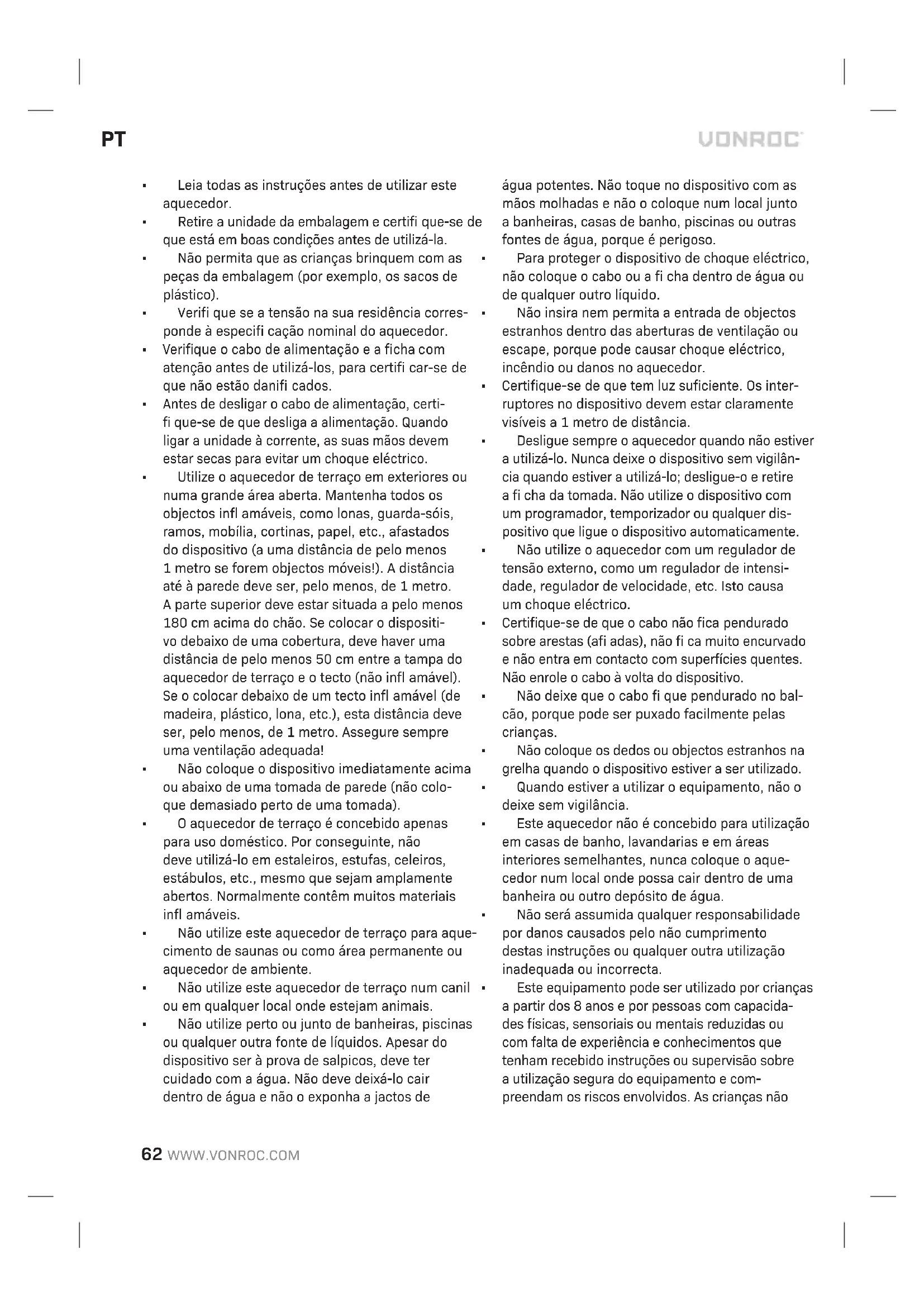 LEIA COM ATENÇÃO: o aquecedor por infraverme- lhos é concebido para um funcionamento seguro. Não obstante, a instalação, a manutenção e funcionamento do aquecedor podem ser perigo- sas. Ocumprimento dos seguintes procedimentos reduz o risco de incêndio, choque eléctrico, feri- mentos em pessoas e mantém um período mínimo de instalação. Guarde estas instruções para uma utilização futura.PT