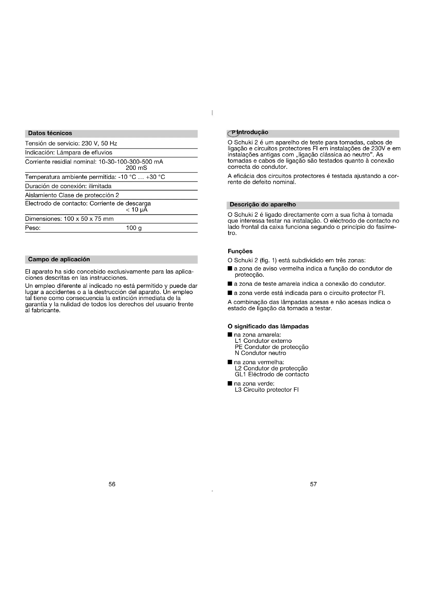Figura 11: Se iluminan todas las lámparas en la sección amari- lla. L3 se ilumina adicionalmente cuando se pulsa la tecla T, al mismo tiempo se apaga PE. Después de que haya disparado el interruptor diferencial se apagan todas las lámparas. El conductor de protección tiene una resistencia elevada pero aún permitida. Resistencia de conductor de protección aún permitida R ~ no permitido R ~ permitido Schuki 2 22.01.2004 15:49 Uhr Seite 5457 P Introdução O Schuki 2 é um aparelho de teste para tomadas, cabos de ligação e circuitos protectores FI em instalações de 230V e em instalações antigas com „ligação clássica ao neutro”. As tomadas e cabos de ligação são testados quanto à conexão correcta do condutor. A eficácia dos circuitos protectores é testada ajustando a cor- rente de defeito nominal. Descrição do aparelho O Schuki 2 é ligado directamente com a sua ficha à tomada que interessa testar na instalação. O eléctrodo de contacto no lado frontal da caixa funciona segundo o princípio do fasíme- tro. Funções O Schuki 2 (fig. 1) está subdividido em três zonas: y a zona de aviso vermelha indica a função do condutor de protecção. y a zona de teste amarela indica a conexão do condutor. y a zona verde está indicada para o circuito protector FI. A combinação das lâmpadas acesas e não acesas indica o estado de ligação da tomada a testar. O significado das lâmpadas y na zona amarela: L1 Condutor externo PE Condutor de protecção N Condutor neutro y na zona vermelha: L2 Condutor de protecção GL1 Eléctrodo de contacto y na zona verde: L3 Circuito protector FI