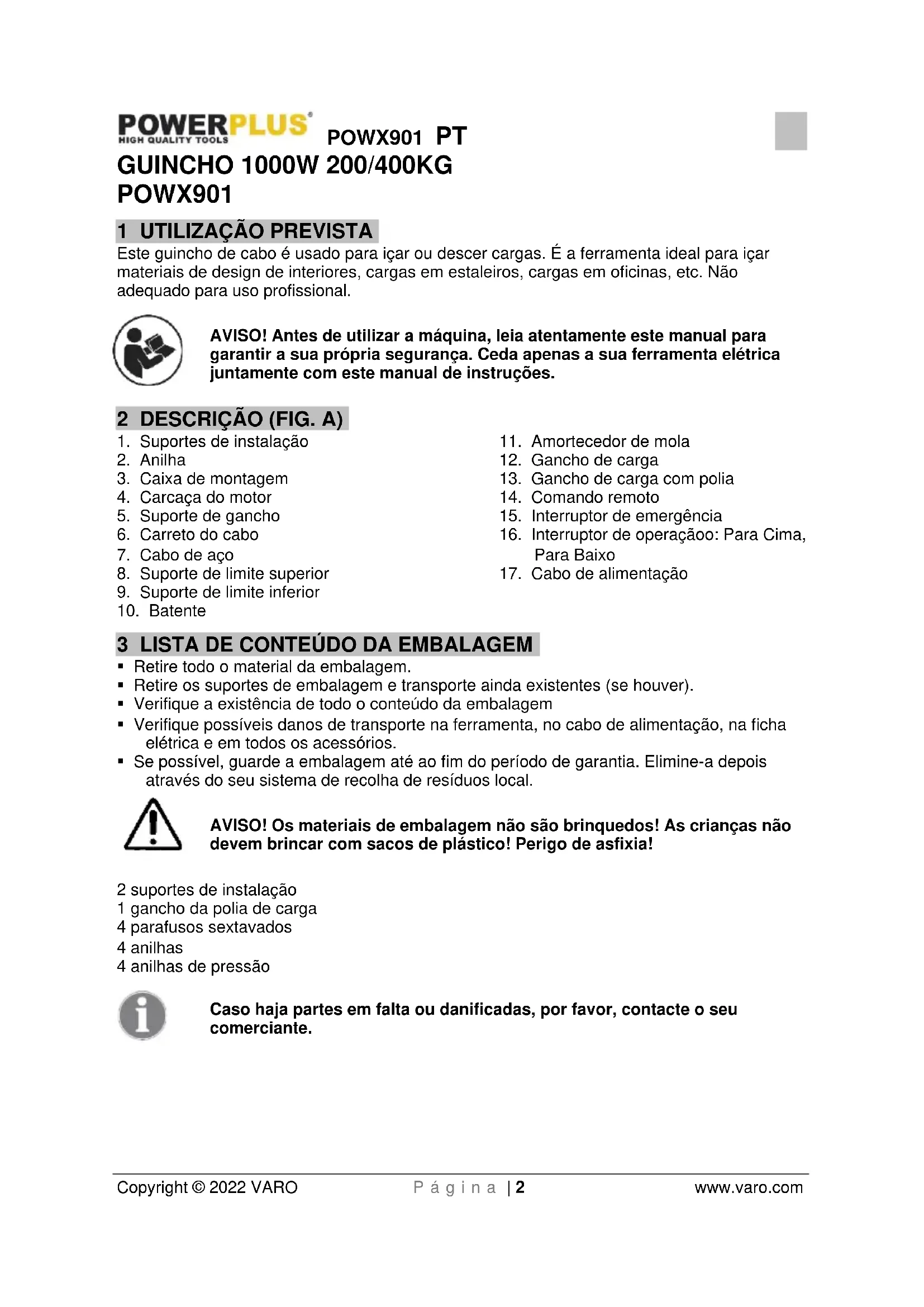 - Não é permitido usar o micro-interruptor como interruptor para desligar nem pode ser desmantelado. O micro-interruptor é um dispositivo de segurança para evitar que o peso seja içado além do limite.POWX901 PT Copyright © 2022 VARO P á g i n a | 6 www.varo.com