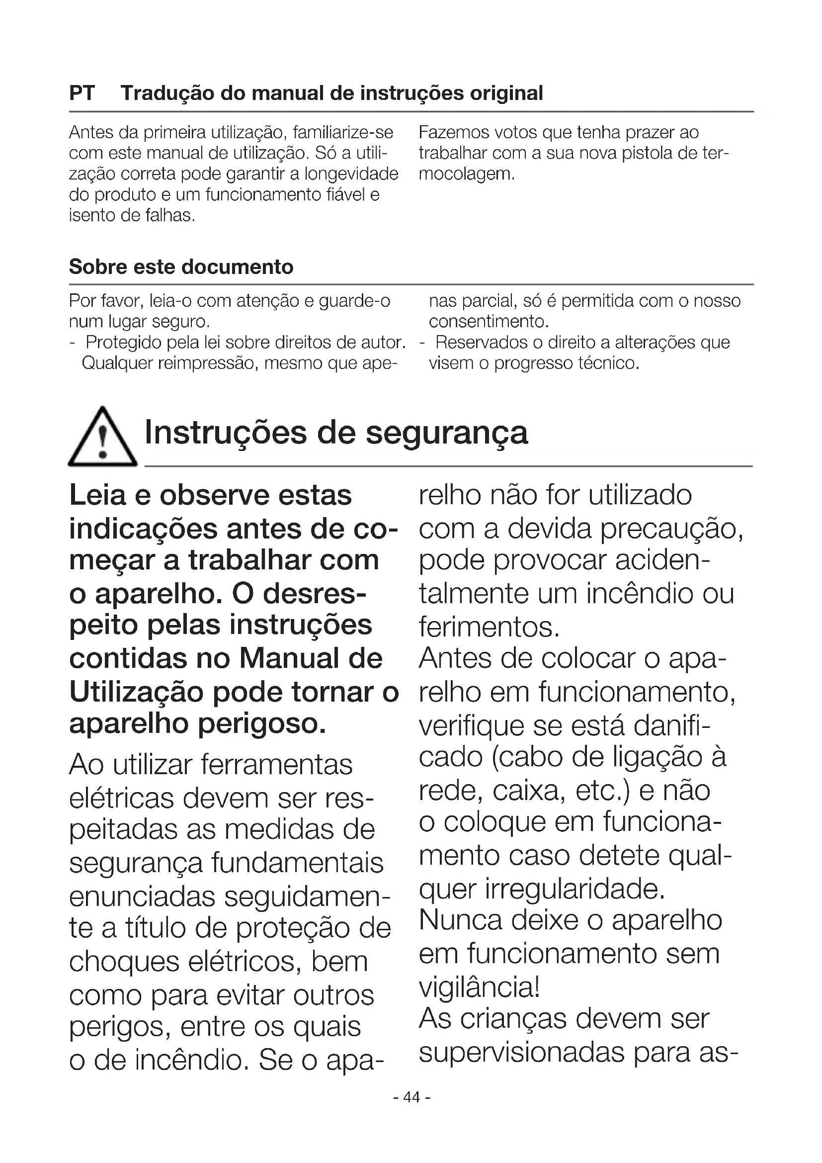 (continuo sin conmutación) Potencia: Fase de calentamiento 175W Fase de reposo aprox. 16W Fase de trabajo aprox. 40W Fase de calentamiento 200W Fase de reposo aprox. 16W Fase de trabajo aprox. 45W Clase de protección: II II Peso: 300 g 320 g Barritas de pegamento: Barritas de pegamento origi- nales STEINEL y Henkel Barritas de pegamento origi- nales STEINEL y Henkel Reservado el derecho de introducir modificaciones técnicas- 44 - Leia e observe estas indicações antes de co- meçar a trabalhar com o aparelho. O desres- peito pelas instruções contidas no Manual de Utilização pode tornar o aparelho perigoso. Ao utilizar ferramentas elétricas devem ser res- peitadas as medidas de segurança fundamentais enunciadas seguidamen- te a título de proteção de choques elétricos, bem como para evitar outros perigos, entre os quais o de incêndio. Se o apa- relho não for utilizado com a devida precaução, pode provocar aciden- talmente um incêndio ou ferimentos. Antes de colocar o apa- relho em funcionamento, verifique se está danifi- cado (cabo de ligação à rede, caixa, etc.) e não o coloque em funciona- mento caso detete qual- quer irregularidade. Nunca deixe o aparelho em funcionamento sem vigilância! As crianças devem ser supervisionadas para as- Antes da primeira utilização, familiarize-se com este manual de utilização. Só a utili- zação correta pode garantir a longevidade do produto e um funcionamento fiável e isento de falhas. Fazemos votos que tenha prazer ao trabalhar com a sua nova pistola de ter- mocolagem. Tradução do manual de instruções original Sobre este documento Por favor, leia-o com atenção e guarde-o num lugar seguro. - Protegido pela lei sobre direitos de autor. Qualquer reimpressão, mesmo que ape- nas parcial, só é permitida com o nosso consentimento. - Reservados o direito a alterações que visem o progresso técnico. Instruções de segurança PT- 45 -