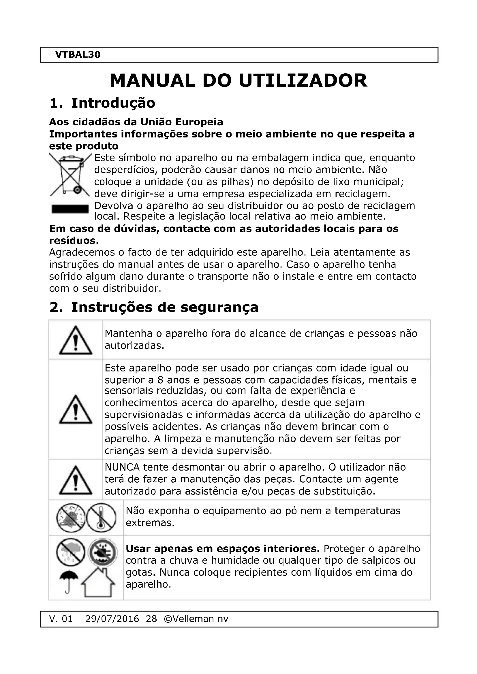 Encontre gratuitamente o manual do aparelho VTBAL30 VELLEMAN em formato PDF.