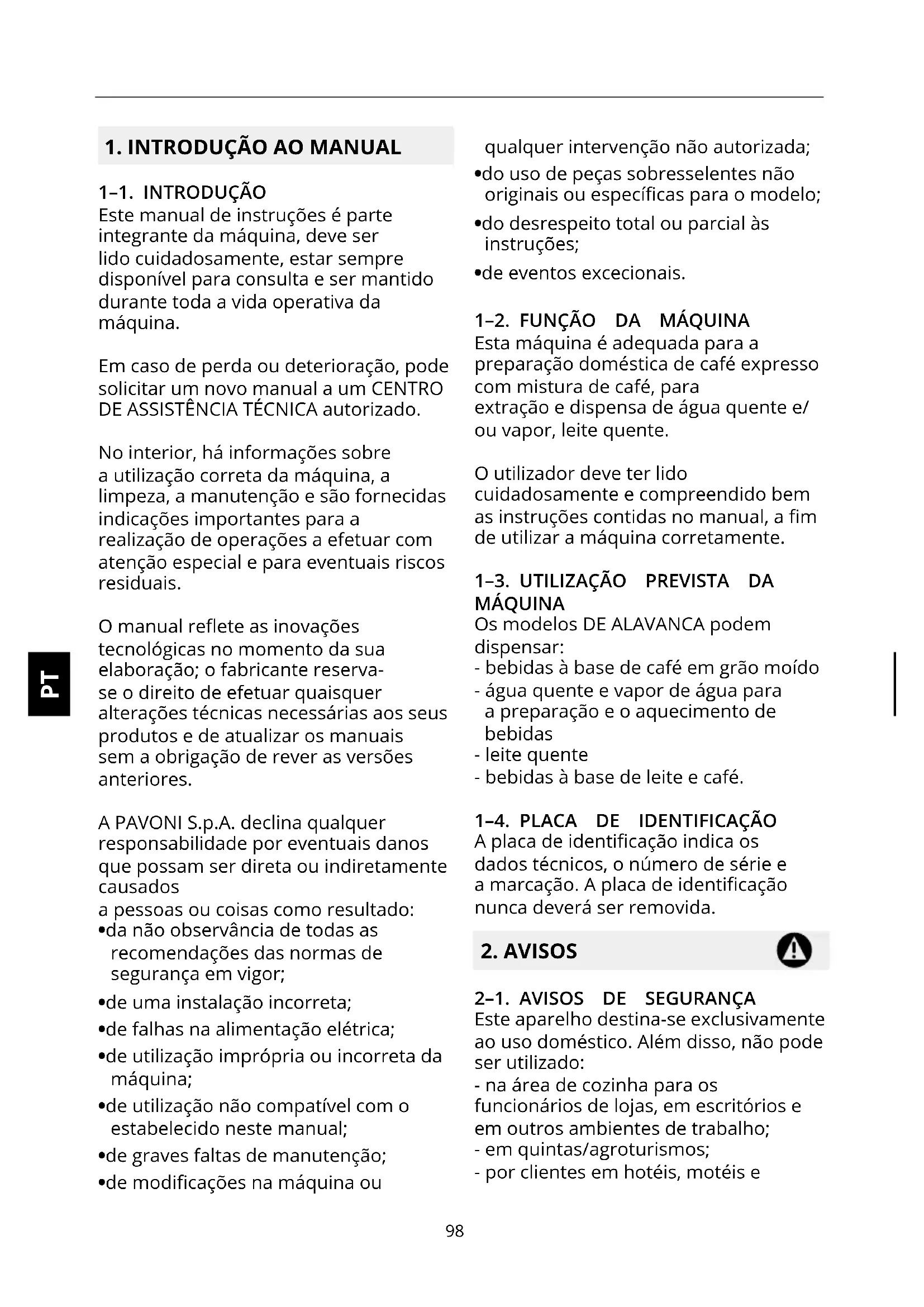 1–1. INTRODUÇÃO Este manual de instruções é parte integrante da máquina, deve ser lido cuidadosamente, estar sempre disponível para consulta e ser mantido durante toda a vida operativa da máquina. Em caso de perda ou deterioração, pode solicitar um novo manual a um CENTRO DE ASSISTÊNCIA TÉCNICA autorizado. No interior, há informações sobre a utilização correta da máquina, a limpeza, a manutenção e são fornecidas indicações importantes para a realização de operações a efetuar com atenção especial e para eventuais riscos residuais. O manual reete as inovações tecnológicas no momento da sua elaboração; o fabricante reserva- se o direito de efetuar quaisquer alterações técnicas necessárias aos seus produtos e de atualizar os manuais sem a obrigação de rever as versões anteriores. A PAVONI S.p.A. declina qualquer responsabilidade por eventuais danos que possam ser direta ou indiretamente causados a pessoas ou coisas como resultado:
