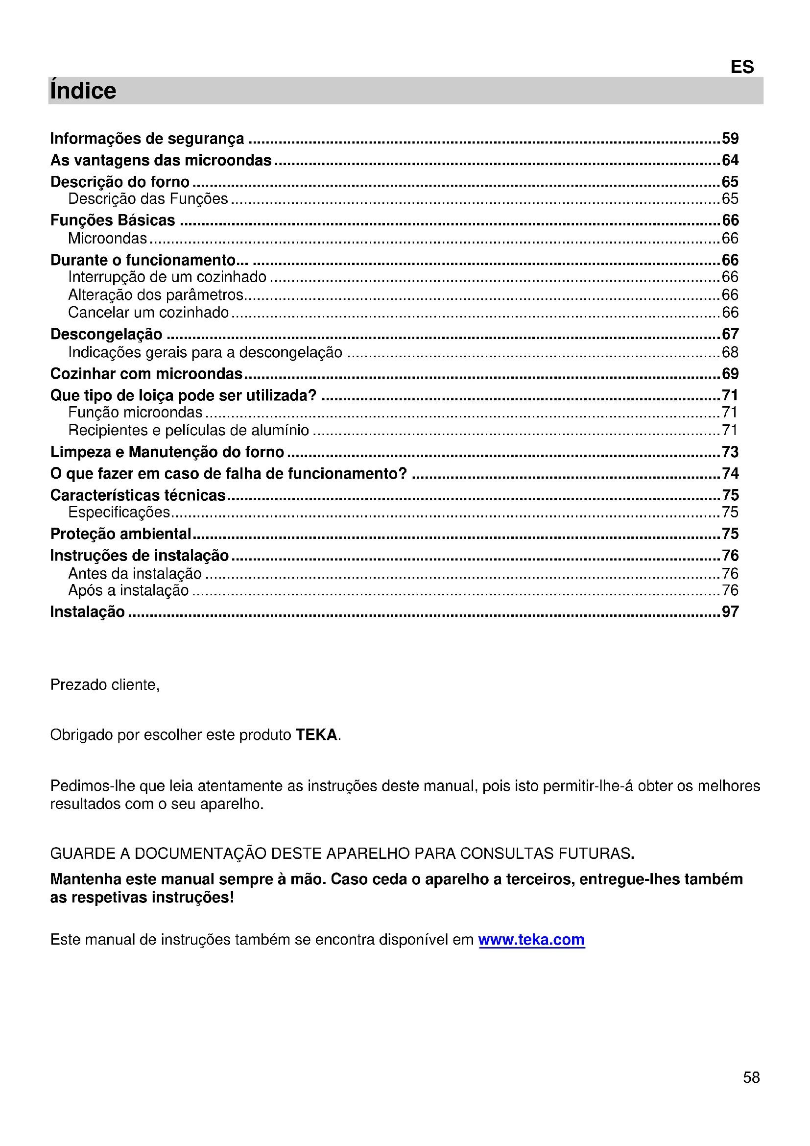 Prezado cliente, Obrigado por escolher este produto TEKA. Pedimos-lhe que leia atentamente as instruções deste manual, pois isto permitir-lhe-á obter os melhores resultados com o seu aparelho. GUARDE A DOCUMENTAÇÃO DESTE APARELHO PARA CONSULTAS FUTURAS. Mantenha este manual sempre à mão. Caso ceda o aparelho a terceiros, entregue-lhes também as respetivas instruções! Este manual de instruções também se encontra disponível em www.teka.com59