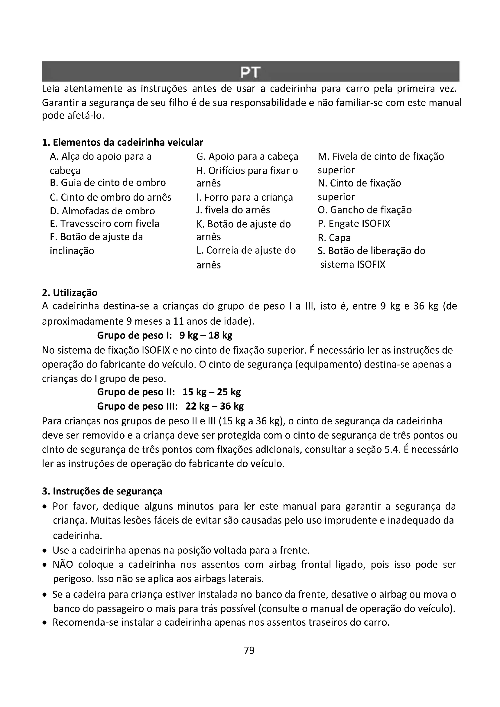 - Por favor, dedique alguns minutos para ler este manual para garantir a segurança da criança. Muitas lesões fáceis de evitar são causadas pelo uso imprudente e inadequado da cadeirinha.